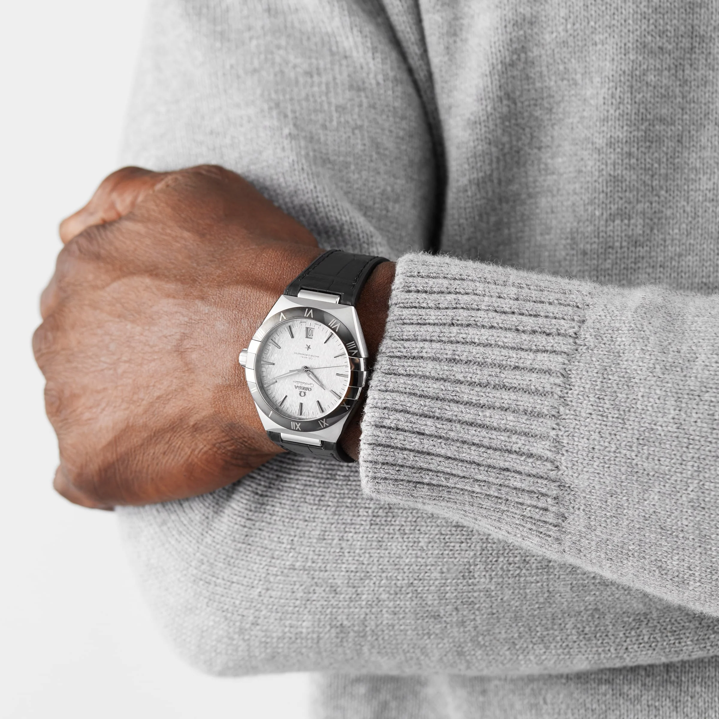 A tribute to Omega’s accomplishments in the 20th century Constellation heritage with the 8900 calibre movement 41mm stainless steel case paired with a black, rubber-lined leather strap Silk-embossed rhodium-grey dial framed by a polished, black ceramic Master chronometer certified by METAS A CELEBRATION OF PRECISION Launched in 1952, the iconic Constellation collection was created to pay tribute to Omega’s countless precision accomplishments during the early 20th century. Powered by the brand’s most advanced movements, the striking models in this collection are characterised by dramatic, enduring design. Each model features four claws on the side of the case, half-moon facets, Roman numerals, and a trapezoidal date window beneath a single star. ENDURING DESIGN This 41mm watch features a stainless case with a black, rubber-lined leather strap. The striking, silk-embossed rhodium-grey dial features blackened hands and hour markers, complimenting the polished black bezel. The 8900 calibre movement provides flawless precision and can be viewed through the transparent caseback.