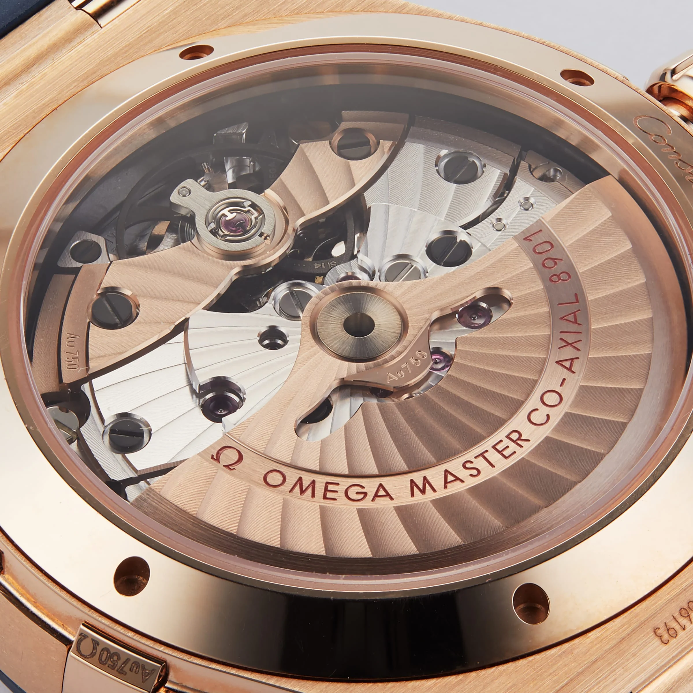 A tribute to Omega’s accomplishments in the 20th century Constellation heritage with the 8901 calibre movement 41mm 18K Sedna™ gold case paired with a blue, rubber-lined leather strap Sun-brushed blue dial framed by a polished blue ceramic bezel Master chronometer certified by METAS A TRIBUTE TO OMEGA’S 20TH CENTURY ACHIEVEMENTS Launched in 1952, the iconic Constellation collection was created to pay tribute to Omega’s countless precision accomplishments during the early 20th century. Powered by the brand’s most advanced movements, the striking models in this collection are characterised by dramatic, enduring design. Each model features four claws on the side of the case, half-moon facets, Roman numerals, and a trapezoidal date window beneath a single star. LUXURIOUS TONES This 41mm timepiece features an 18K Sedna™gold case, paired with a deep blue, rubber-lined leather strap. The sun- brushed blue dial is framed by a polished, blue ceramic bezel with Ceragold™ Roman numerals. The 8901 calibre movement provides unrivalled precision and performance.