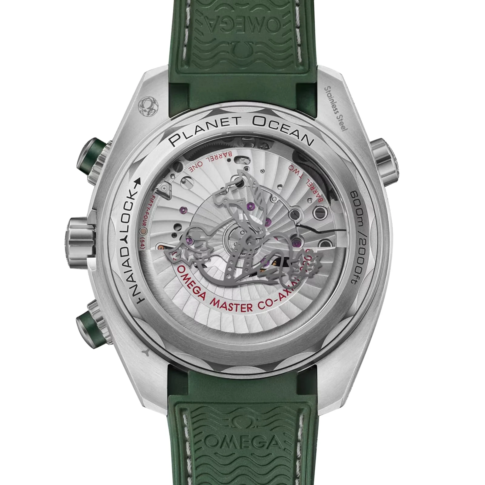 Planet Ocean - a celebration of Omega's dive watch legacy Seamaster heritage driven by the Co-Axial Master Chronometer Calibre 9900 movement Water resistant to 60 bar (600 metres) Housed in a 45.5mm brushed stainless steel case paired with an integrated green rubber strap Brushed stainless steel dial framed by a brushed green ceramic bezel ring DESIGNED FOR DIVERS Introduced in 2005, the Planet Ocean 600m collection pays tribute to the brand's ocean heritage with modern design, creative touches, and revolutionary Master Chronometer movements. Designed to meet the unique needs of divers, this updated range is equipped with Super-LumiNova coated indexes for visibility underwater, as well as water resistance to 60 bar (600 metres). POWERFUL PRECISION Paying homage to the brand's dive watch heritage, this 45.5mm watch features a brushed stainless steel dial with a date window at 6 o'clock, green ceramic sub-dials, and Arabic numerals, hands, and hour makers in PVD stainless steel with a brushed finish. The classic brushed stainless steel case features pushers with green ceramic rings and is paired with an integrated green rubber strap with a structured pattern and contrasting stitching. Power and precision are delivered by the Co-Axial Master Chronometer Calibre 9900 movement, which can be seen through the transparent, sapphire crystal case back. Super-LumiNova ensures visibility in the depths of the ocean, while a 60-hour power reserve further enhances performance.