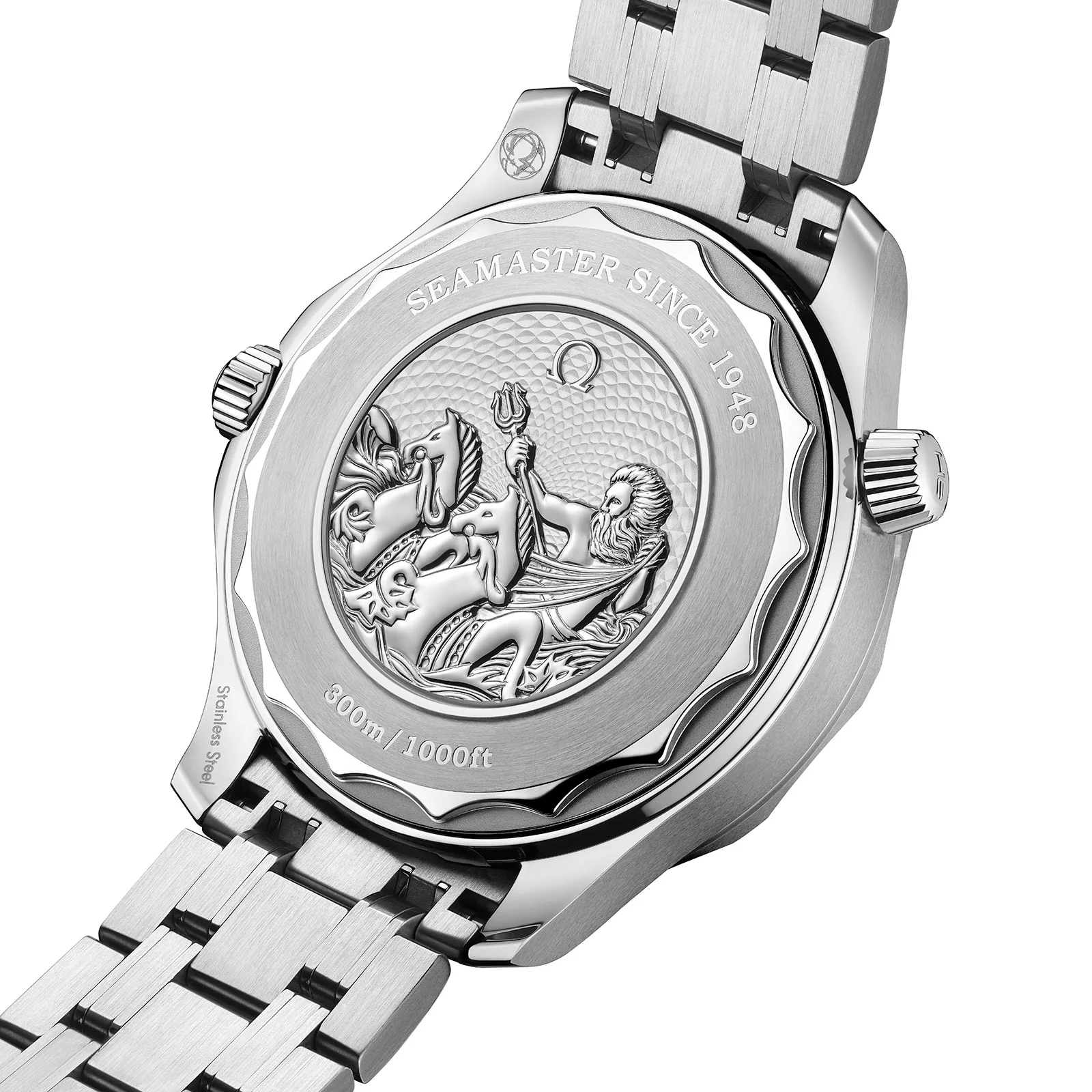 Seamaster Diver 300m - an updated icon 42mm case and bracelet in stainless steel Summer Blue ceramic dial with the collection's wave design and a gradient finish Blue ceramic bezel with a summer blue enamel diving scale Powered by a Master Chronometer calibre 8800 movement AN UPDATED ICON Since 1993, the Seamaster Diver 300m has enjoyed a legendary following. To mark 25 years since its release, the collection has been beautifully updated from the inside out, updating the materials and technology while retaining the original design and ocean spirit. Available in both 42mm and 43.5mm, the new models are all powered by Master Chronometer calibres for extraordinary precision, performance, and magnetic resistance. SUMMER BLUE Crafted from ceramic, the sleek Summer Blue dial features a laser engraved wave pattern, raised indexes filled with unique light blue Super-LumiNova, and re-shaped rhodium-plated skeleton hands. Mirroring the tones of the dial, the blue ceramic bezel features a summer blue enamel diving scale, while on the reverse, the case back features a stamped, commemorative Seamaster logo. The helium escape valve has always been a key feature of the 300m collection - this new model features a conical valve with ingenious, patented technology that enables the watch to remain water resistant to 50 metres, even if the valve is accidentally opened while under the water. The 42mm stainless steel case fastens securely with a steel bracelet.
