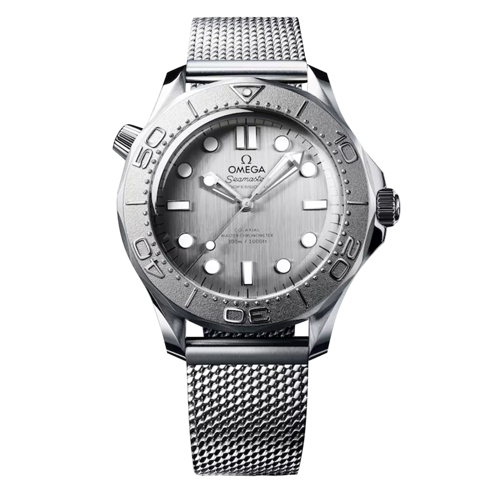 Since 1993, the Seamaster Diver 300M has enjoyed a legendary following. Today’s modern collection has embraced that famous ocean heritage and updated it with OMEGA’s most advanced innovation and design. This 42 mm model is crafted in stainless steel and includes a grade 5 titanium bezel with a laser-ablated diving scale in positive relief and a single dot of white Super-LumiNova at 12 o’clock. PVD stainless steel is used to create the brushed dial as well as the polished and skeletonized hands and indexes, which are filled with white Super-LumiNova. Other markings, including the OMEGA logo, are transferred in black. The watch is presented on a brushed mesh bracelet with clasp, and is driven by the OMEGA Co-Axial Master Chronometer Calibre 8806, which can be seen through the sapphire-crystal caseback.