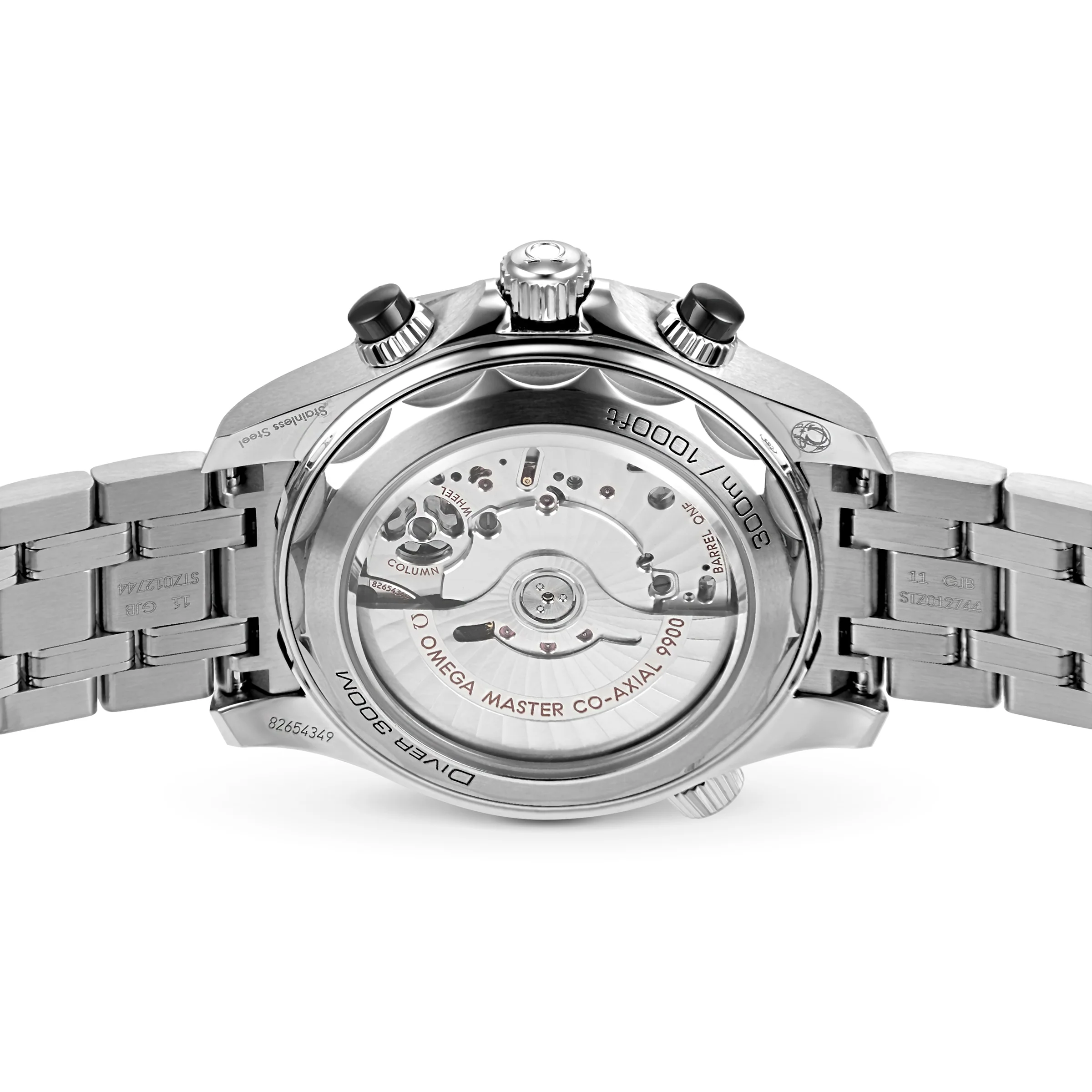 The classic dive watch for professionals, updated and refined 44mm chronograph model in stainless steel The choice of James Bond for over 25 years OMEGA Calibre 9900 - a Co-Axial Master Chronometer movement Polished black ceramic bezel and white enamel diving scale THE DIVERS CHOICE Since the original release in 1993, the Seamaster Professional Diver 300 has become a style icon and inspired a devoted following, being one of the first OMEGA timepieces to sport the Professional inscription on the dial amongst a push to update the heritage of the Seamaster with advanced technology and refined aesthetics. This iconic piece was immediately adopted by the James Bond franchise to best represent the alluring combination of dry martini elegance and action-packed durability of the world’s most famous spy. METAS CERTIFIED This 44 mm chronograph model has a stainless steel case with a polished black ceramic bezel and a white enamel diving scale. The chronograph pushers and dial match the bezel in polished black ceramic, featuring a laser-engraved wave pattern and a date window at 6 o’clock. The subdial hands are rhodium-plated, along with all other hands and indexes which are filled with white Super-LumiNova. The helium escape valve has been subtly redesigned with an easy-to- use conical design. The watch is presented on a stainless steel bracelet and is driven by the OMEGA Master Chronometer Calibre 9900, officially certified by METAS to resist magnetic fields up to 15,000 gauss. This industry-leading movement can be seen through the sapphire-crystal on the wave-edged caseback.
