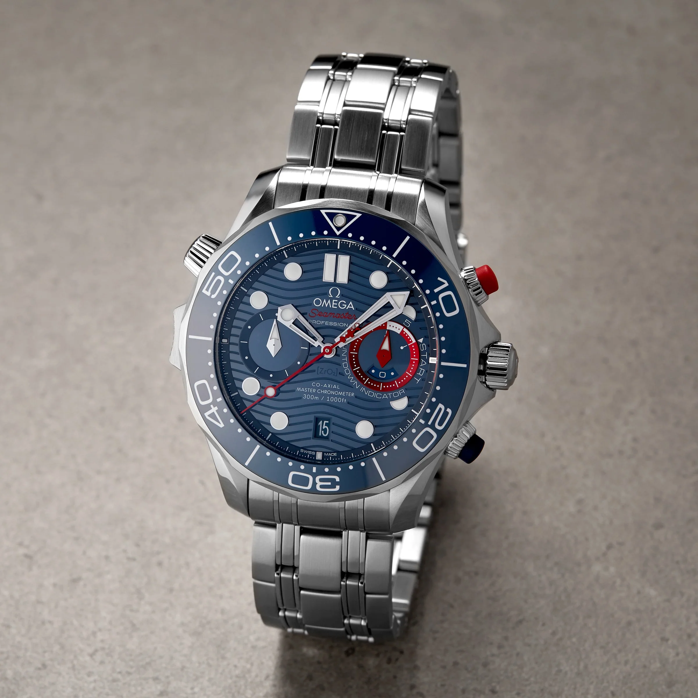 America’s Cup commemorative edition of the OMEGA Diver 300M Celebrating OMEGA’s role as Official Timekeeper of the 36th regatta 44mm Chronograph with regatta countdown timer and patented CHRONO LOCK OMEGA Calibre 9900 movement with 60-hr power reserve Stainless steel case and bracelet with complimentary rubber strap AN ELITE SAILING TIMEPIECE Drawing on decades of ocean-going heritage, this Seamaster Diver 300M is the perfect timepiece to celebrate OMEGA’s role as Official Timekeeper of the 36th America’s Cup, combining sailing inspiration with pioneering new technology. The provenance of OMEGA in this venerable competition dates back to 2000, and the storied brand’s involvement in elite sailing includes the sponsorship of Emirates Team New Zealand since 1995, a stretch that includes several wins of the famous “Auld Mug”. AMERICA’S CUP DETAILS This 44 mm chronograph is crafted from stainless steel, with a bezel ring in blue ceramic and a white enamel diving scale. The legendary Diver waves are laser-engraved on the blue ceramic dial, and as a special touch, the red aluminium central seconds chronograph hand features an America’s Cup on the counterweight. Crucially for a regatta-inspired timepiece, this special edition Seamaster features a race countdown indicator ring crafted in red anodized aluminium. The indicator features an hour disc underneath the subdial, designed to highlight the vital minute hand during sailing. The sailing design theme is carried over to the red anodized aluminium minute and rhodium-plated small seconds hand, both evoking the form of a boat hull. OMEGA’s exclusive CHRONO LOCK system is included to secure the chronograph functions when needed, adding secure timekeeping and the ability to lock your measured time. The caseback is engraved with tributes to the “36th America’s Cup” and “Auckland 2021”, and are all filled with blue lacquer. All owners will receive the watch in a special presentation box in the colours of the America’s Cup. The watch is paired with a stainless steel bracelet and comes with an alternative complimentary rubber strap, both featuring OMEGA’s new patented Quick Change system. At the heart of the timepiece is the automatic Co-Axial Master Chronometer Calibre 9900, featuring industry-leading magnetic resistance of 15,000 gauss and a 60-hr power reserve, all certified by Swiss watchmaking’s most prestigious seal of quality and accuracy, METAS.