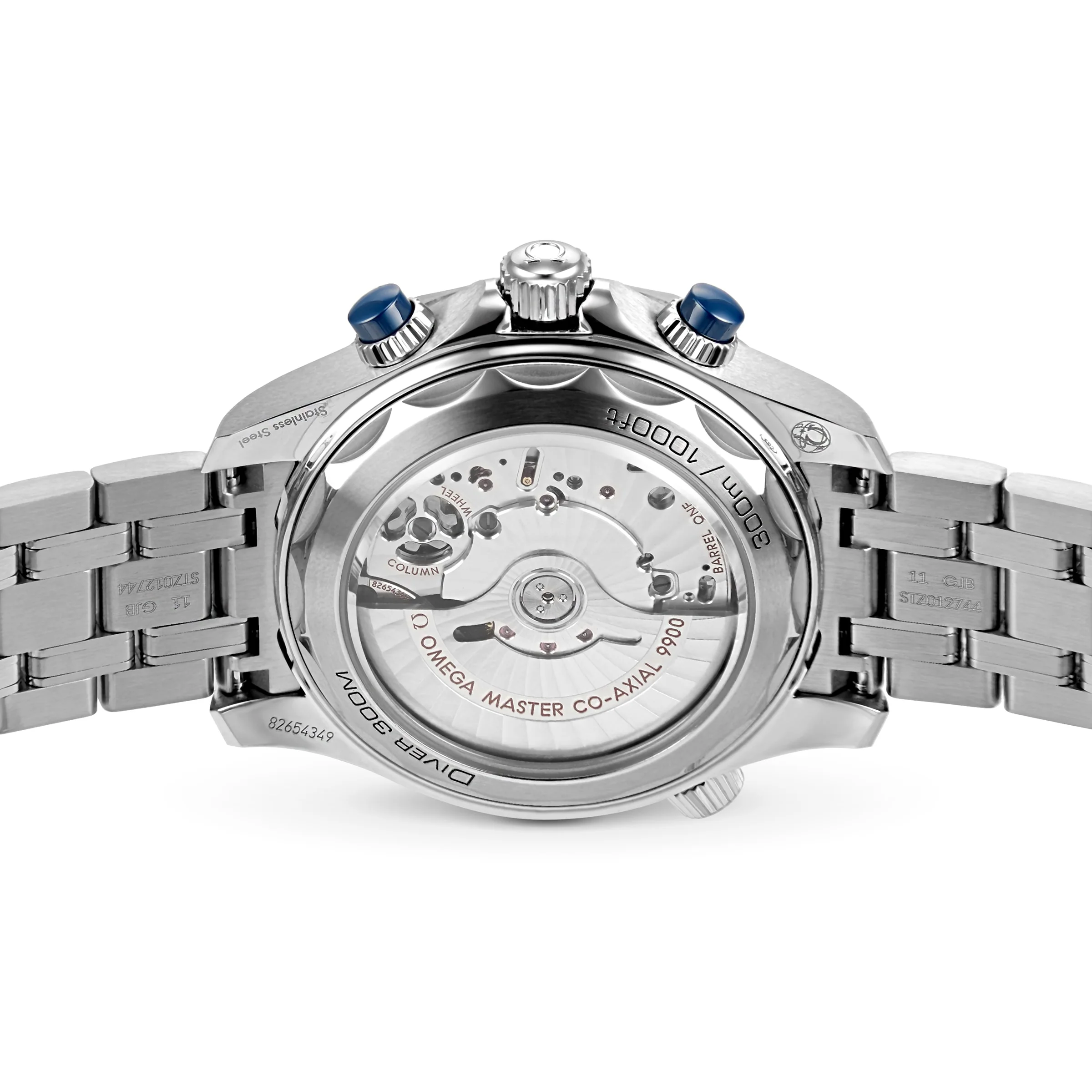 The classic dive watch for professionals, updated and refined 44mm chronograph model - stainless steel case and bracelet The James Bond watch for over a quarter of a century OMEGA Calibre 9900 - a Co-Axial Master Chronometer movement Sun-brushed chrome ceramic dial with laser-engraved wave pattern A STYLE ICON Since the original release in 1993, the Seamaster Professional Diver 300 has become a style icon and inspired a devoted following, being one of the first OMEGA timepieces to sport the Professional inscription on the dial amongst a push to update the heritage of the Seamaster with advanced technology and refined aesthetics. This iconic piece was immediately adopted by the James Bond franchise to best represent the alluring combination of dry martini elegance and action-packed durability of the world’s most famous spy. OMEGA EXCELLENCE This 44mm chronograph model of the iconic Seamaster Diver 300M has a stainless steel case and a polished blue ceramic bezel with white enamel diving scale. The chronograph pushers are also blue ceramic, while the dial is chrome toned ceramic with a sun-brushed finish. The famous Diver 300M wave pattern is laser- engraved. The watch is presented on a stainless steel bracelet and visible through the wave-edged caseback is the OMEGA Master Chronometer Calibre 9900, a twin-barrel movement with 60 hours of power reserve and officially certified by METAS to resist magnetic fields up to 15,000 gauss.