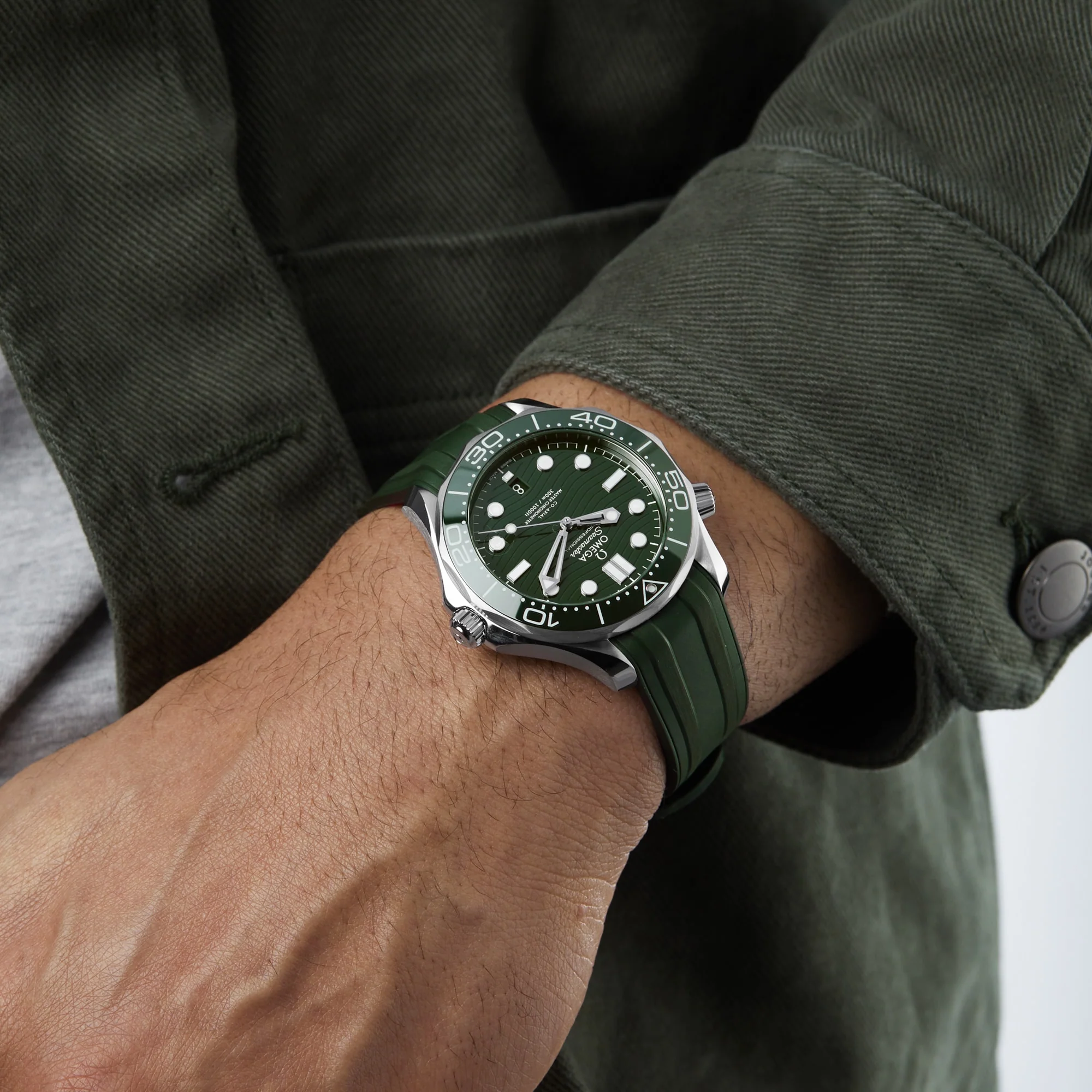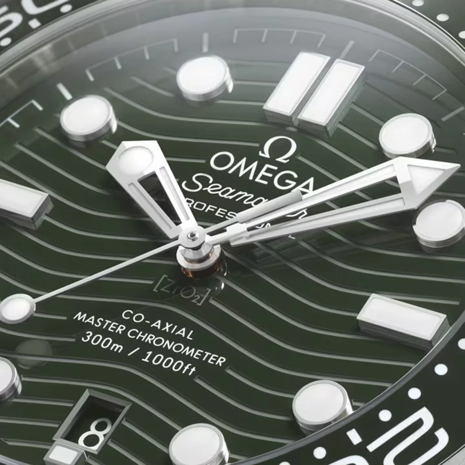 Designed for divers and professionals Water resistant to 30 bar (300 metres) MEGA Master Chronometer Calibre 8800 42mm stainless steel case paired with a striking green rubber strap Master Chronometer officially certified by METAS DIVE DEEP INTO EXTRAORDINARY TIMEKEEPING Paying tribute to Omega’s ocean heritage, the Seamaster Planet Ocean collection features Master Chronometer certification, advanced designs and water resistance to 30 bar (300 metres). Designed for use underwater, the Pro Diver collection includes co-axial escapement for long-lasting precision, a silicon balance spring for superior anti-magnetism, and a newly designed helium escape valve. ULTIMATE PRECISION This 42mm model is presented in a stainless steel case, framed by a green ceramic bezel with a white enamel diving scale, and presented on a green rubber strap. A further nod to the collection’s marine legacy, the polished green ceramic dial features a laser-engraved wave pattern and is organised with rhodium-plated skeleton hands and raised indexes coated in white Super-LumiNova for increased visibility. This Master Chronometer is certified by METAS and powered by the 8800 calibre movement for flawless precision.