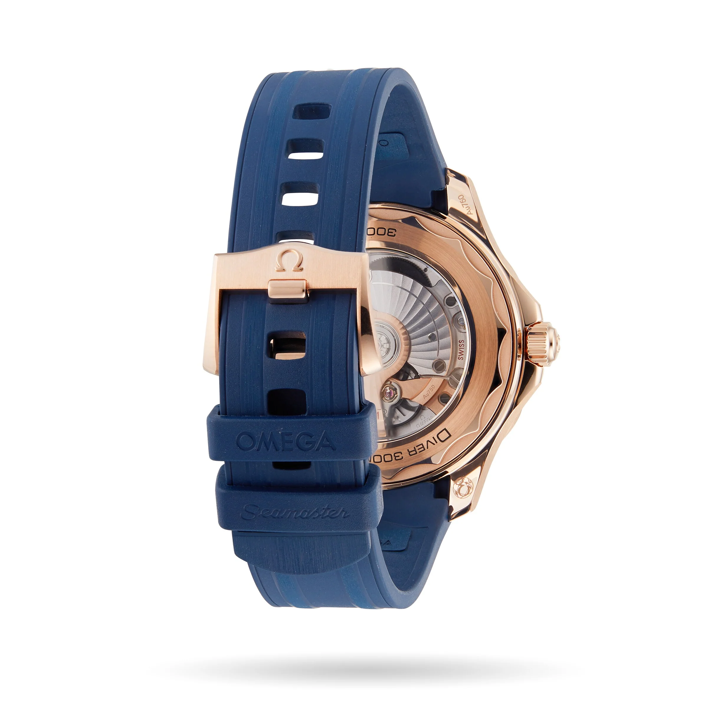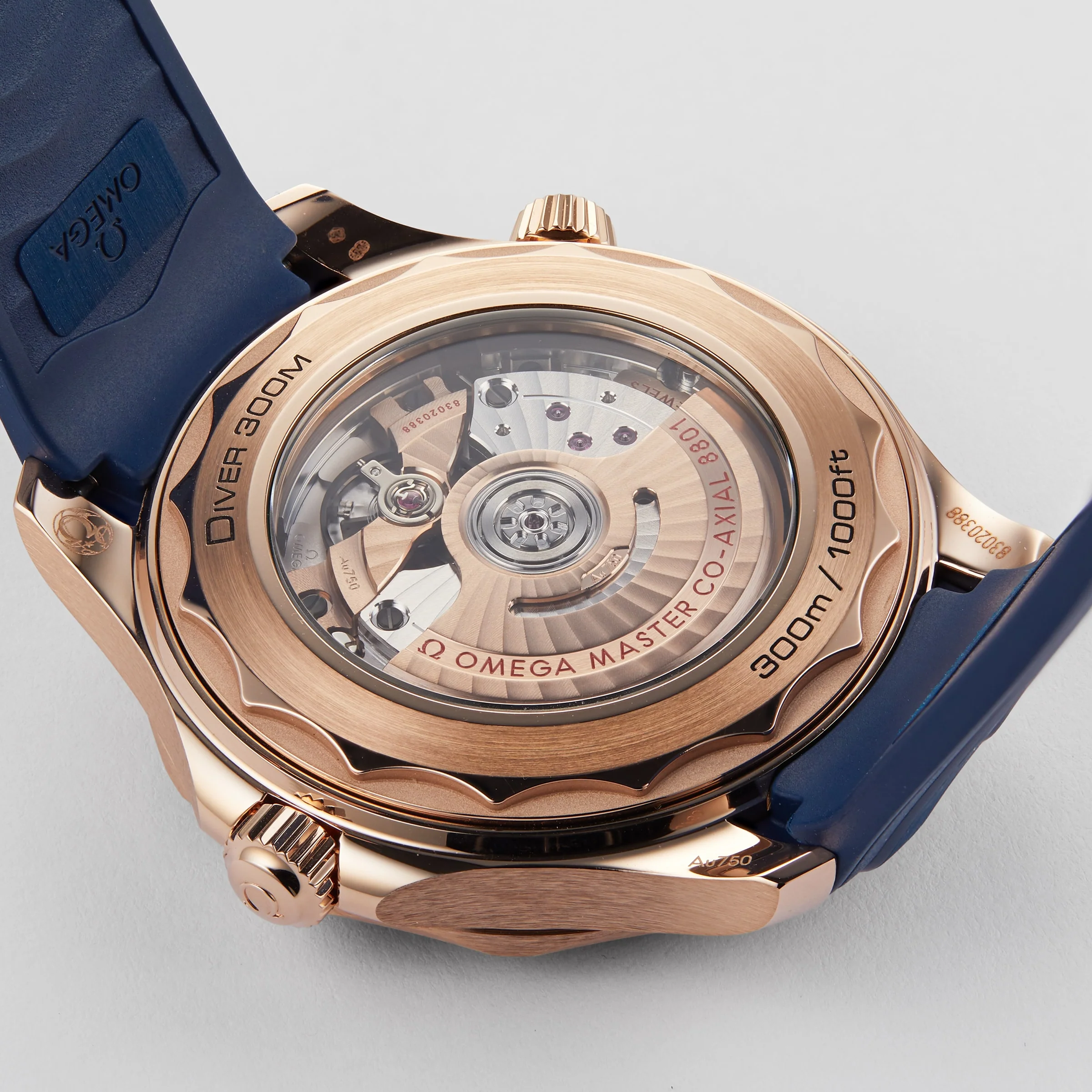 The classic dive watch for professionals, updated and refined 42mm model in 18K Sedna™ gold, blue ceramic and Ceragold™ The choice of James Bond for over 25 years OMEGA Calibre 8801 - a Co-Axial Master Chronometer movement Blue ceramic dial with OMEGA’s iconic laser-engraved wave pattern ELEGANCE AND DURABILITY The famous Seamaster Diver 300M was originally released in 1993, one of the first OMEGA timepieces to feature the ‘Professional’ inscription on the dial, garnering further renown for being chosen by the James Bond franchise for its military heritage, dry martini elegance and action-packed durability. Maintaining the long ocean heritage of OMEGA, the modern Seamaster Diver 300M collection is updated using cutting-edge technology, resulting in a luxury watch with industry-leading accuracy, timeless design and modern materials. UNIQUE MATERIALS This 42mm 18K Sedna™ gold model features a polished blue ceramic bezel with a Ceragold™ diving scale, and a matching ceramic blue dial with a laser engraved wave pattern. The skeleton hands, raised indexes and strap buckle are also crafted from 18K Sedna™ gold, and the look is completed with an integrated blue rubber strap. The watch is powered by OMEGA’s Co-Axial Master Chronometer Calibre 8801 movement, officially certified by METAS to withstand magnetic fields up to 15,000 gauss. The 18K Sedna™ gold, wave-edged caseback houses a sapphire crystal for a clear view of this wonderful movement.