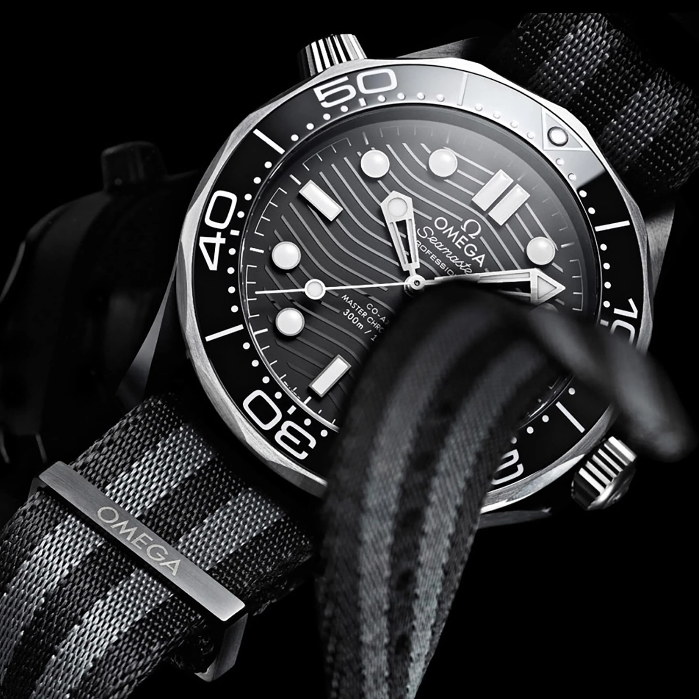 The modern iteration of the iconic 1957 timepiece OMEGA’s classic dive watch for professionals and 007 Unparalleled precision and durability matched with timeless design OMEGA Co-Axial calibre 8806 movement, certified Master Chronometer 43.5mm grade 5 titanium and black ceramic case with fabric strap MILITARY HERITAGE The famous Seamaster Diver 300M was originally released in 1993, one of the first OMEGA timepieces to feature the ‘Professional’ inscription on the dial, garnering further renown for being chosen by the James Bond franchise for its military heritage, dry martini elegance and action-packed durability. Maintaining the long ocean heritage of OMEGA, the modern Seamaster Diver 300M collection is updated using cutting-edge technology, resulting in a luxury watch with industry-leading accuracy, timeless design and modern materials. ADVANCED MATERIALS This 43.5 mm model is crafted from ceramic and grade 5 titanium and features a black ceramic bezel with white enamel diving scale. The matching black ceramic dial is laser- engraved with the classic Seamaster wave pattern. The raised indexes and skeleton hands are PVD-coated titanium, filled with white Super-LumiNova, contrasting beautifully with the black dial. For ease of use, the helium escape valve at 10 o’clock has been redesigned with a new conical shape. The watch is paired with a black and grey NATO fabric strap secured with titanium loops and is powered by OMEGA’s Co-Axial Master Chronometer Calibre 8806 movement, officially certified by METAS to withstand magnetic fields up to 15,000 gauss. The titanium wave-edged caseback houses a sapphire crystal for a clear view of this incredible movement.