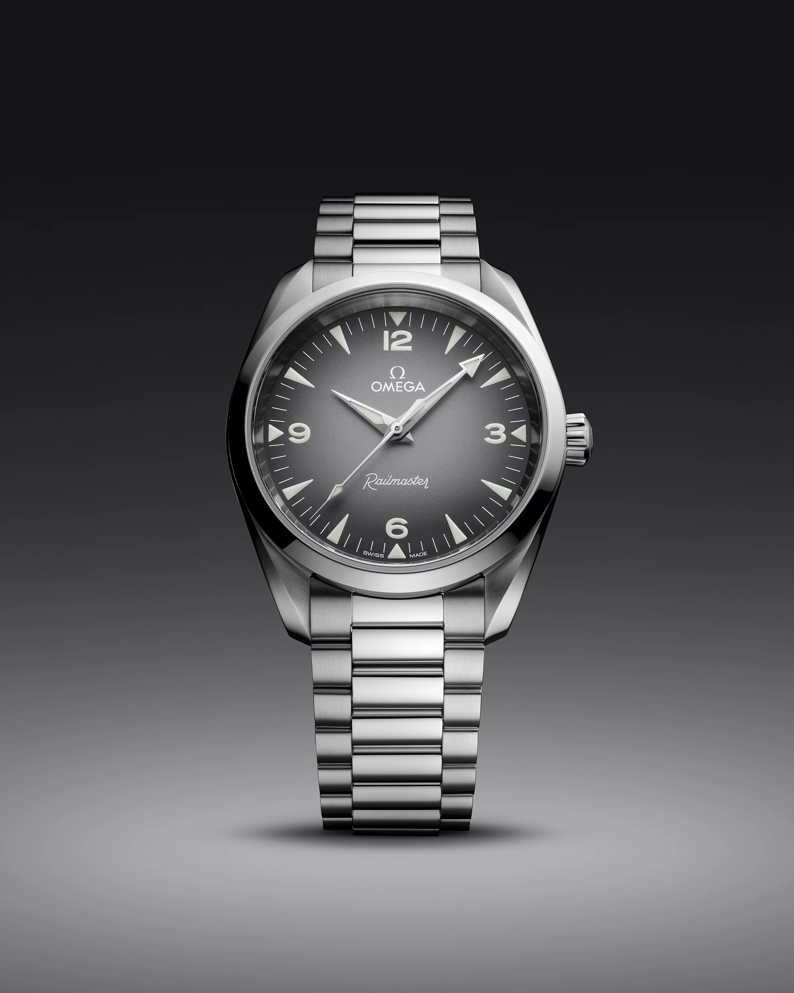 The symmetrical 38 mm case is brushed and polished and is presented on an integrated bracelet that includes an easy comfort setting, as well as brushed and polished links. In keeping with the original Railmaster’s easy-to-read display, the dial of this model is grey with a black gradient and features large numerals and hour markers in white Super-LumiNova.