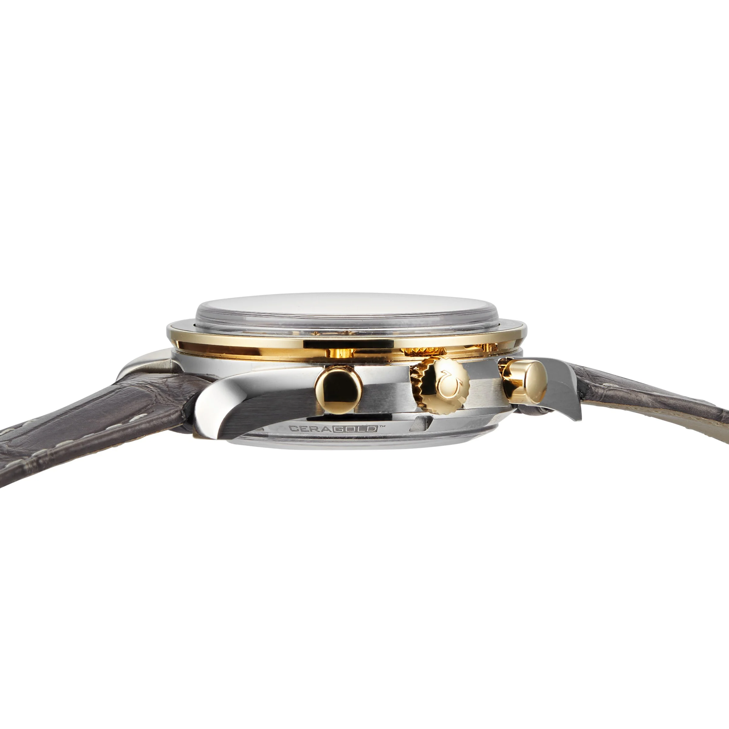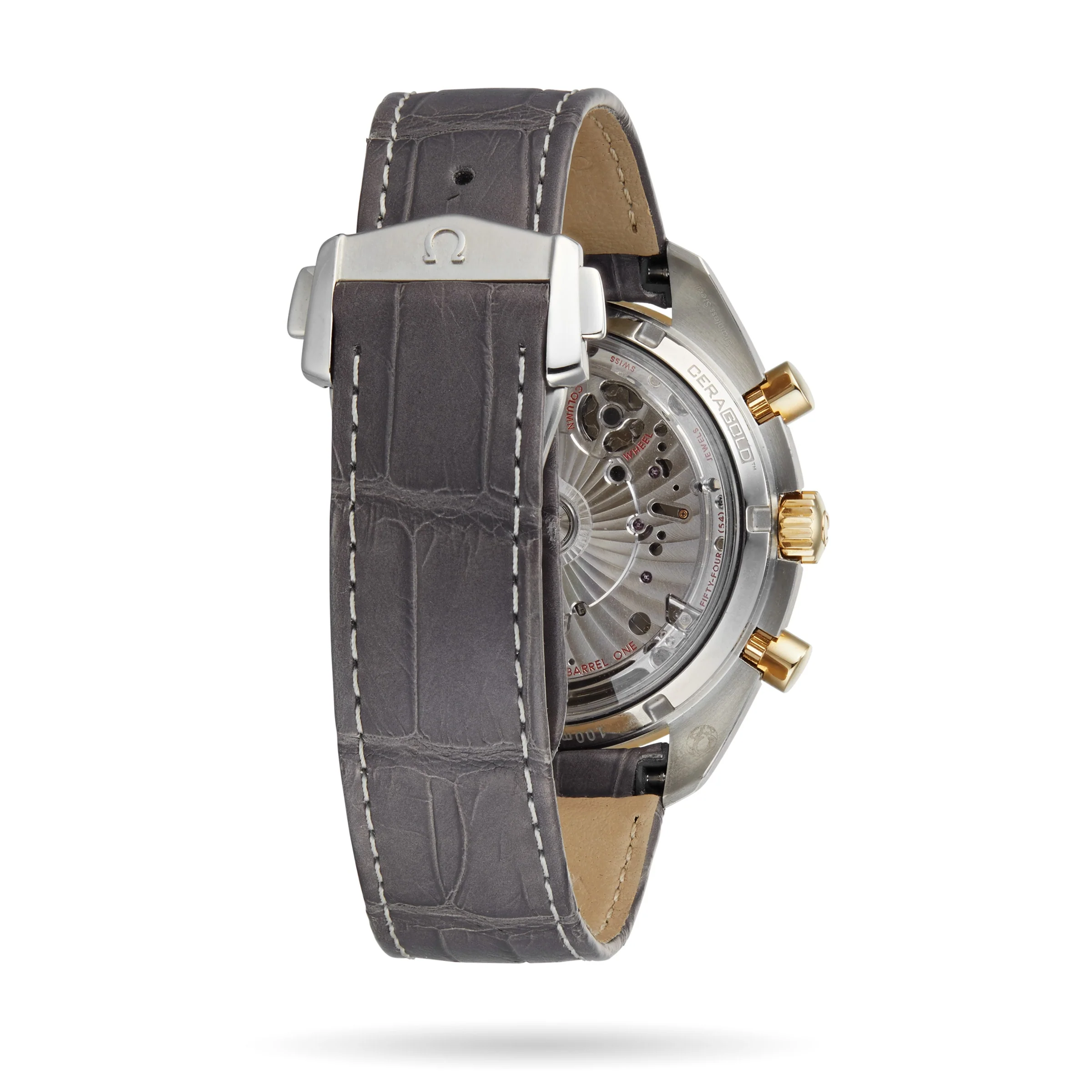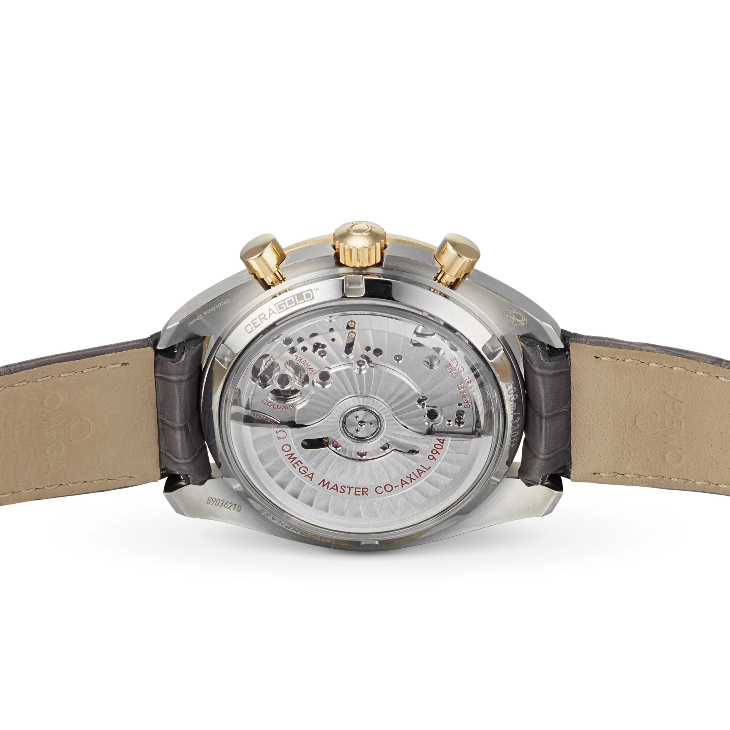 Paying tribute to Omega’s lunar history Speedmaster heritage featuring the 9904 calibre movement 44.25mm stainless steel and 18K yellow gold case paired with a grey leather strap Tachymeter and chronometer features OMEGA Master Chronometers are officially certified by METAS LOVED ON EARTH AND BEYOND The Omega Speedmaster was the first watch to touch down on the moon’s surface, so it’s only right that the Omega Speedmaster Moonphase is not only capable of measuring every moment here on Earth, but also the phases of the moon. Celebrating a pioneering moment, this model features two realistic moon images, displayed on a metallic crystal disc. If you look closely, you can even see Neil Armstrong’s iconic footprint. ULTIMATE PRECISION This 44.25mm watch features a stainless steel and 18K yellow gold case, paired with a grey leather strap and a green ceramic bezel ring with a Ceragold™ tachymeter scale. The grey, sun-brushed dial features 18K yellow gold indexes and hands, as well as an accurate Moonphase indicator at 6 o’clock, with a metallic crystal disc microstructured to obtain two high-resolution images of the moon. Delivering flawless precision, the 9904 calibre movement is officially certified and offers incredible performance. This timepiece is also water resistant to 10 bar (100 metres).