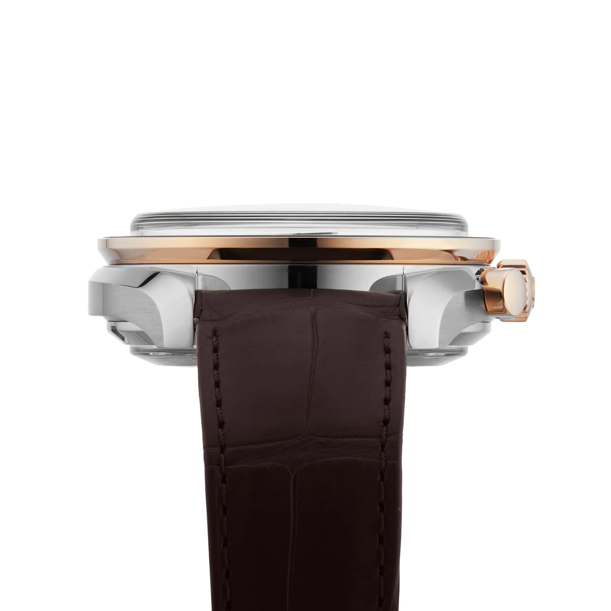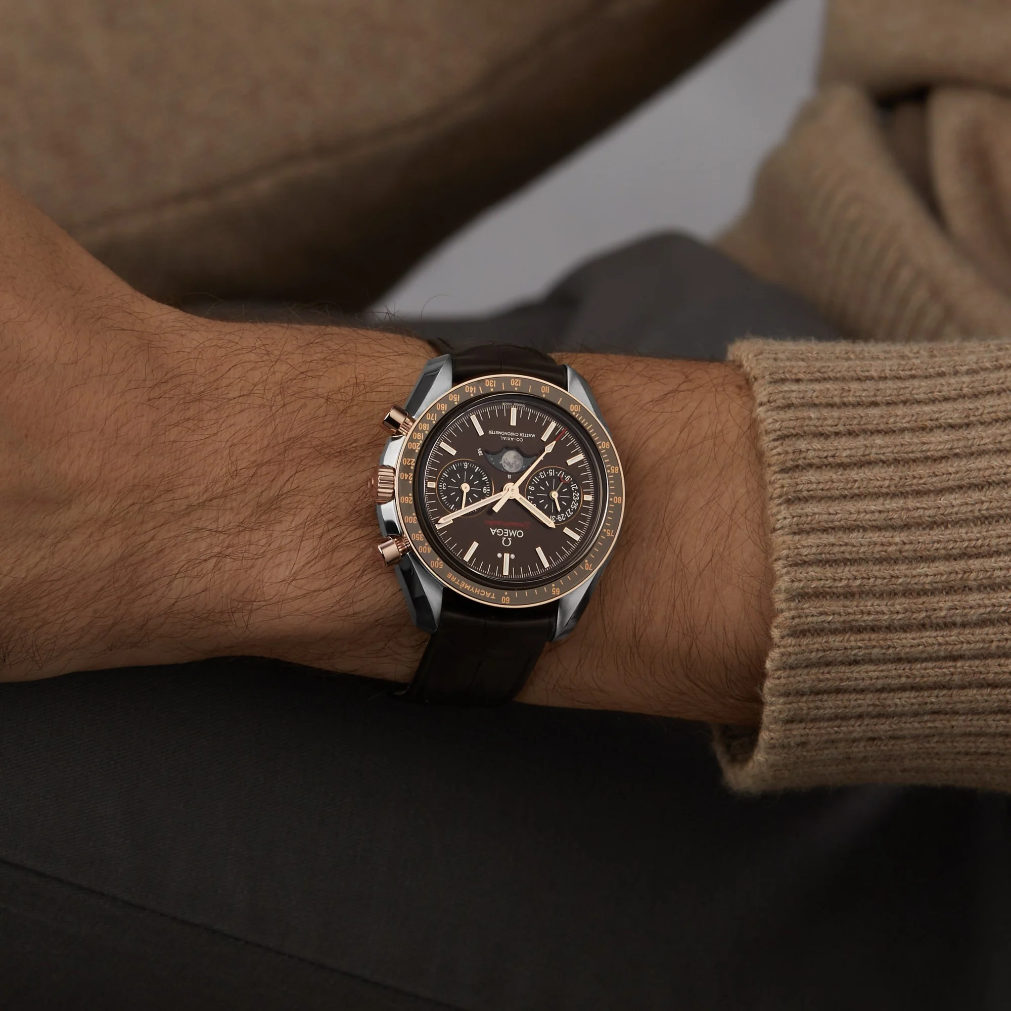 A celebration of a pioneering moment Features a realistic moon image displayed on the dial 42.5 mm stainless steel and 18K Sedna™ gold case with a brown leather strap A brown ceramic dial with diamond polished 18K Sedna™ gold hands Powered by the 9904 calibre movement A TRIBUTE TO A PIONEERING MOMENT The Omega Speedmaster was the first watch to touch down on the moon’s surface, so it’s only right that the Omega Speedmaster Moonphase is not only capable of measuring every moment here on Earth, but also the phases of the moon. Celebrating a pioneering moment, Moonphase features a realistic moon image displayed on a metallic crystal disc. If you look closely, you can even see Neil Armstrong’s iconic footprint. A CELEBRATION OF TIME This 42.5 mm model features a brown, brushed ceramic dial with diamond polished 18K Sedna™ gold hands, and two sub-dials. An accurate Moonphase indicator sits at 6 o’clock, microstructured to create a stunning, high resolution image of the moon in the night sky. The stainless steel case is presented on a brown leather strap with a polished foldover clasp, while the brown ceramic bezel ring features a Ceragold™ tachymeter scale. The 9904 calibre movement powers this timepiece with unquestionable precision.