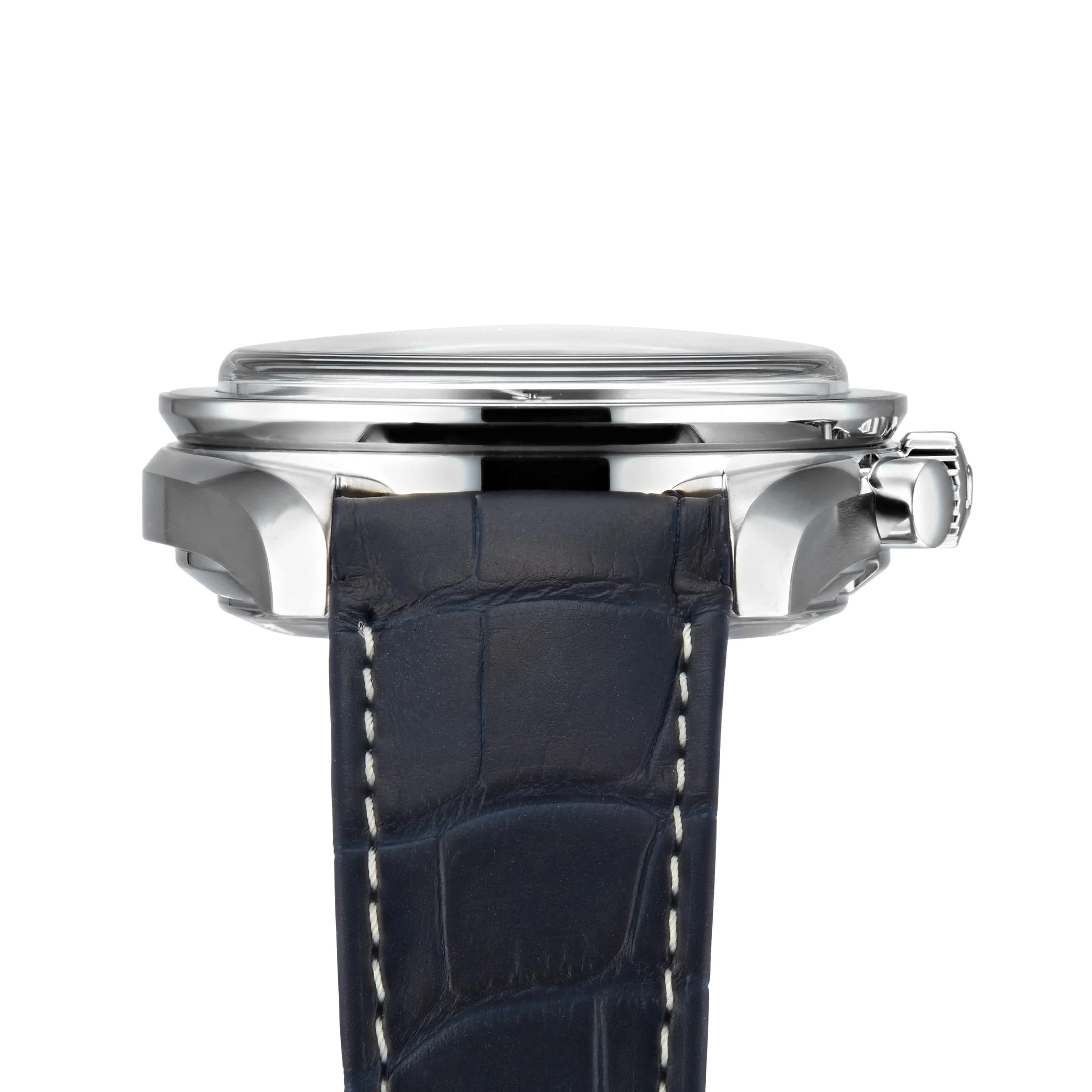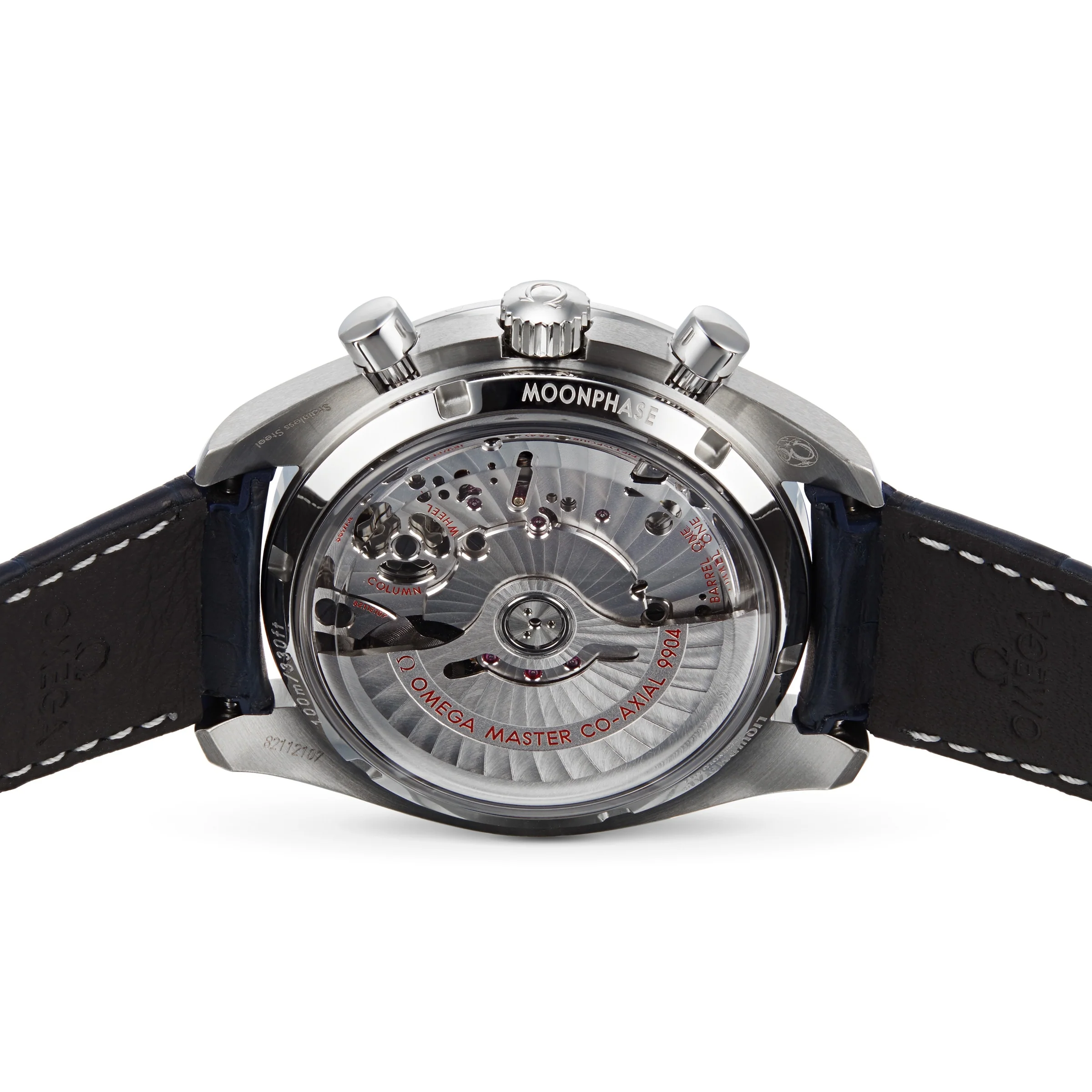 Paying tribute to Omega’s lunar history Accurate Moonphase indicator with two realistic images of the moon Speedmaster heritage featuring the 9908 calibre movement 44.2mm stainless steel case paired with a stainless steel bezel and bracelet Master Chronometer officially certified by METAS LOVED ON EARTH AND BEYOND The Omega Speedmaster was the first watch to touch down on the moon’s surface, so it’s only right that the Speedmaster Moonphase is not only capable of measuring every moment here on Earth, but also the phases of the moon. Celebrating a pioneering moment, this model features two realistic moon images, displayed on a microstructured, metallic crystal disc. If you look closely, you can even see Neil Armstrong’s iconic footprint. ULTIMATE PRECISION This 44.25mm model features a stainless steel case, paired with a striking blue leather strap and a blue ceramic bezel ring with a Liquidmetal™ tachymeter scale. The blue, sun-brushed dial features rhodium-plated hands and hour markers, as well as two sub-dials. Delivering flawless precision, the 9904 calibre movement is officially certified and offers incredible performance. This timepiece is water resistant to 10 bar (100 metres).