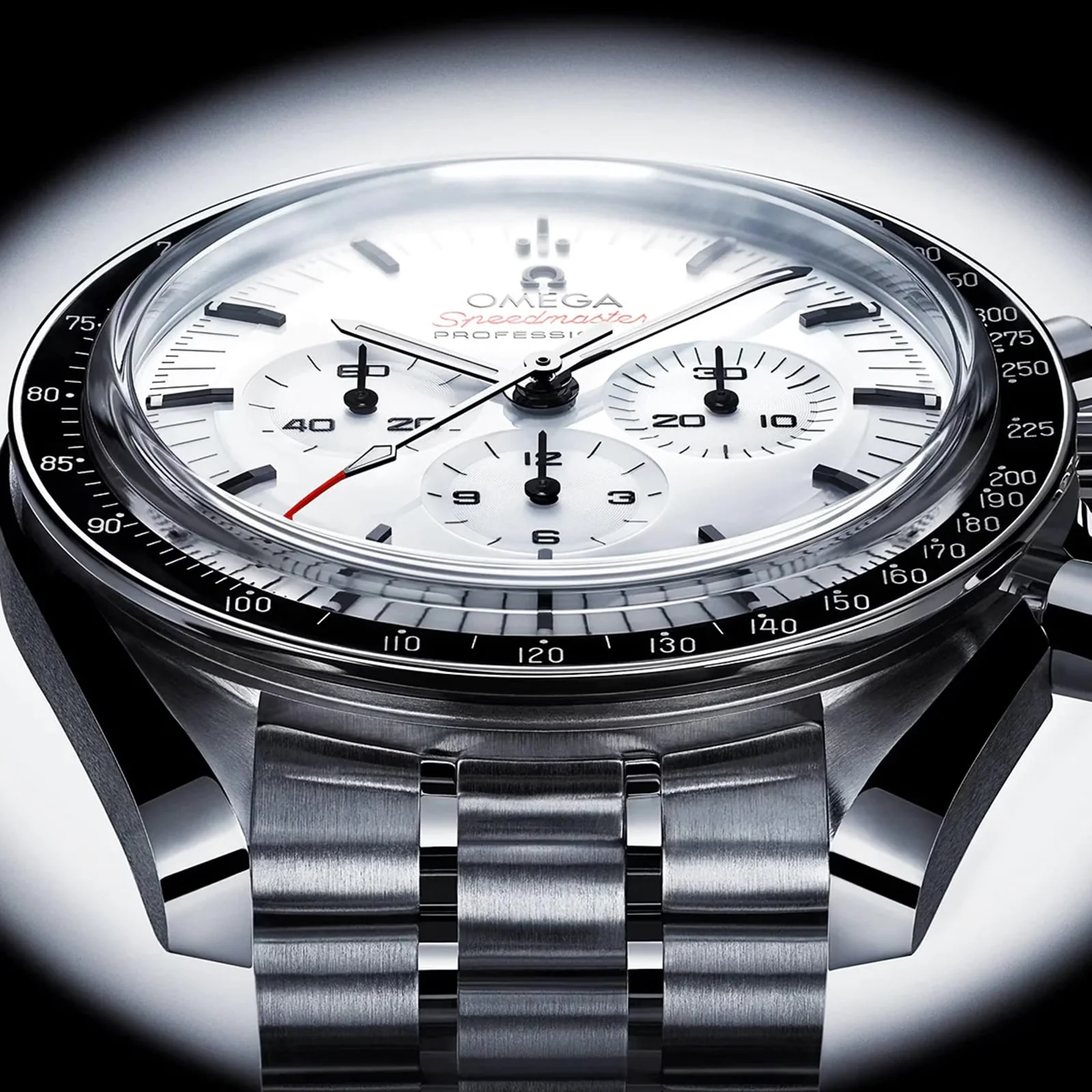 Inspired by the first watch worn on the moon Fourth generation Speedmaster Presented in a 42mm stainless steel case and bracelet Powered by Omega's Master Chronometer 3861 calibre movement Water resistant to 5 bar (50 metres) SPEEDMASTER MOONWATCH PROFESSIONAL Inspired by the 4th generation Speedmaster style worn on the moon, The Speedmaster Moonwatch is one of Omega's most iconic timepieces. Having been part of all six moon landings, this legendary watch captures the heart of the brand's pioneering spirit. Demonstrating the brand's commitment to evolution, this new 2021 edition, offers even more reliability, precision and excellence with Master Chronometer certification. MOON SHADOW This 42mm stainless steel Moonwatch features a co-ordinating strap and a sun brushed white lacquered step dial framed by a black anodised aluminium bezel. For advanced precision and reliability, this Master Chronometer is powered by Omega's 3861 calibre movement and includes built-in chronograph function alongside a small seconds sub dial, 30 minute recorder and 12 hour recorder. This timepiece is complete with the words 'the first watch worn on the moon' engraved into the case back.