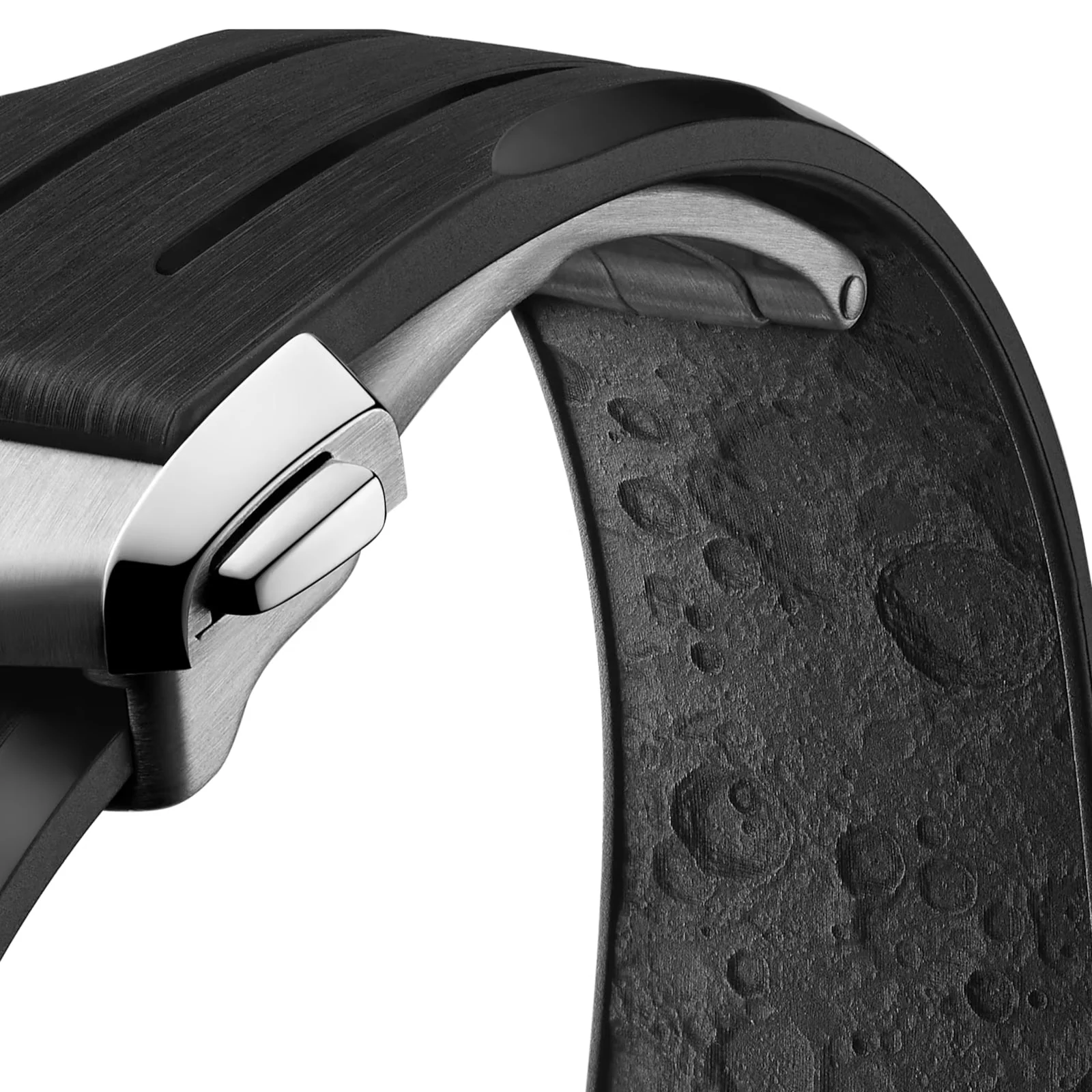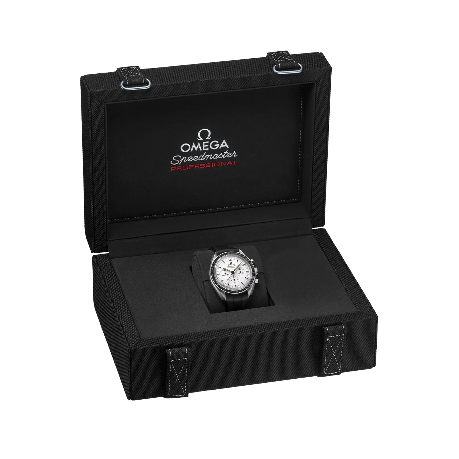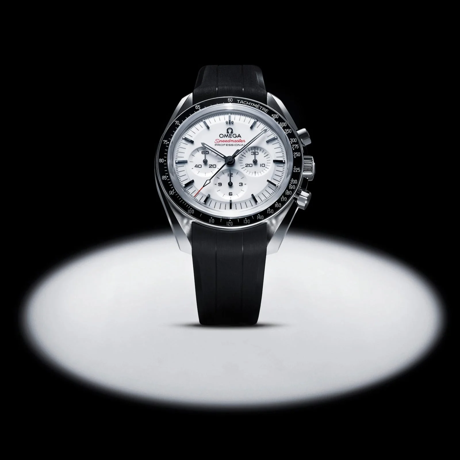 The Speedmaster Moonwatch is one of the world’s most iconic timepieces. Having been a part of all six moon landings, the legendary chronograph is an impressive representation of the brand’s adventurous pioneering spirit. This 42 mm Moonwatch in stainless steel features sapphire crystal glass on the front as well as on the caseback. Inspired by the 4th generation Speedmaster style worn on the moon, it also includes an asymmetrical case, a white lacquered step dial with applied OMEGA logo and indexes, Moonwatch style hands, and the famous dot over 90 on the black anodised aluminium bezel ring. The watch is presented on an integrated black rubber strap with a lunar surface pattern in positive relief on its underside. OMEGA's famous Co-Axial Master Chronometer Calibre 3861 powers the small seconds sub-dial, 30-minute recorder and 12-hour recorder, along with the central chronograph function.