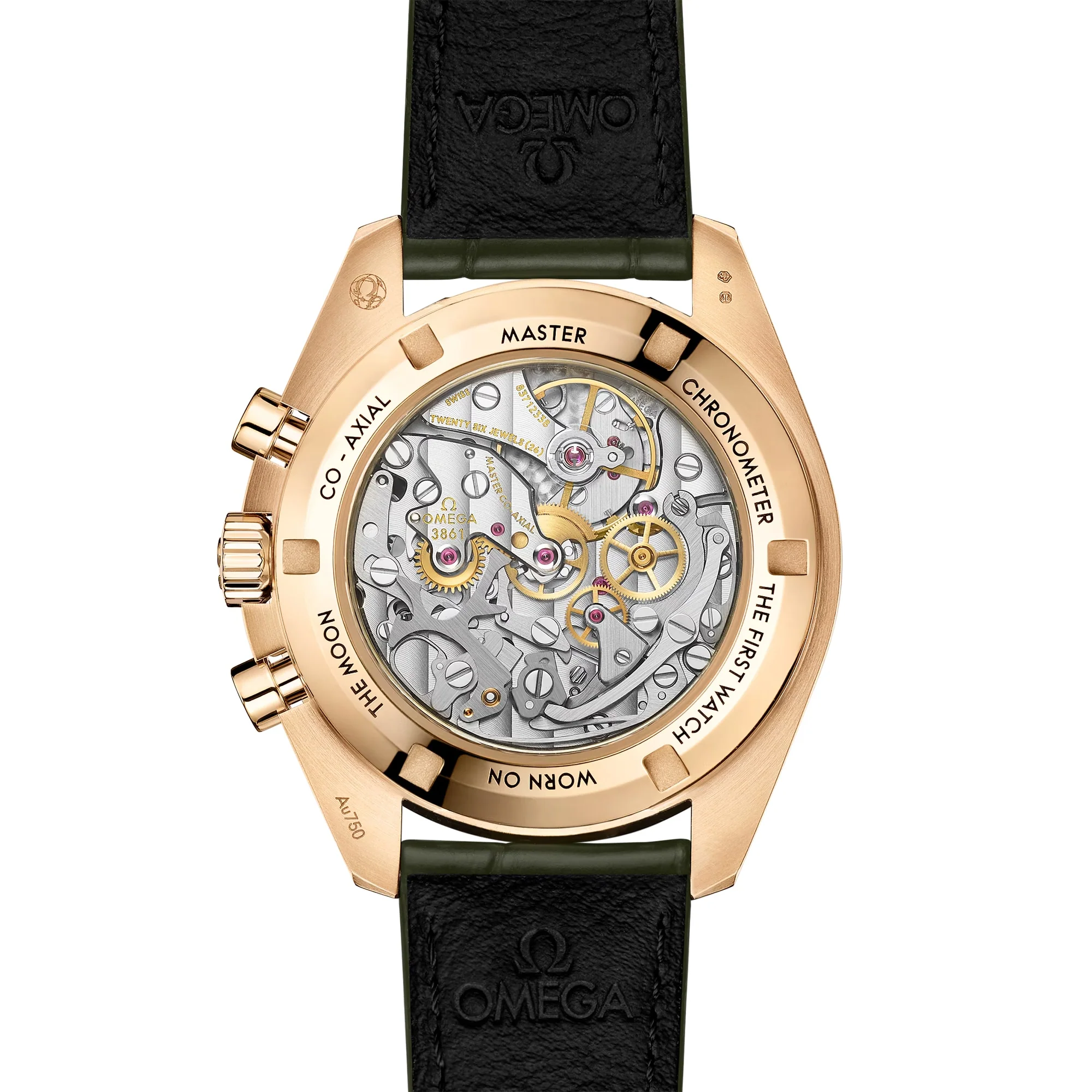 Speedmaster - the first watch on the moon One of the world's most iconic timepieces Presented in a 42mm 18K Moonshine™ Gold asymmetrical case Powered with precision by the OMEGA Co-Axial Master Chronometer Calibre 3861 movement Sun-brushed green PVD step dial framed by a green ceramic bezel ring ICONIC HISTORY Famed as the first watch on the moon, the Speedmaster Professional was worn by Buzz Aldrin when he walked on the lunar surface in 1969. The Speedmaster Moonwatch Professional takes inspiration from the fourth-generation style that was worn by Apollo 11 astronauts during that first moon landing. ADVENTUROUS SPIRIT This bold and uncompromising 42mm model is presented in an 18K Moonshine™ Gold asymmetrical case paired with a green leather strap. The case back is engraved with “First Watch on the Moon” in black. Framed by a green ceramic bezel ring with an OMEGA Ceragold™ tachymeter scale and the famous dot over 90, the sun-brushed green PVD dial features three sub-dials and Moonwatch style hands. Confidently driven by the OMEGA Co-Axial Master Chronometer Calibre 3861 movement and water resistant to 5 bar (50 metres), this watch delivers unrivalled precision on earth and beyond.