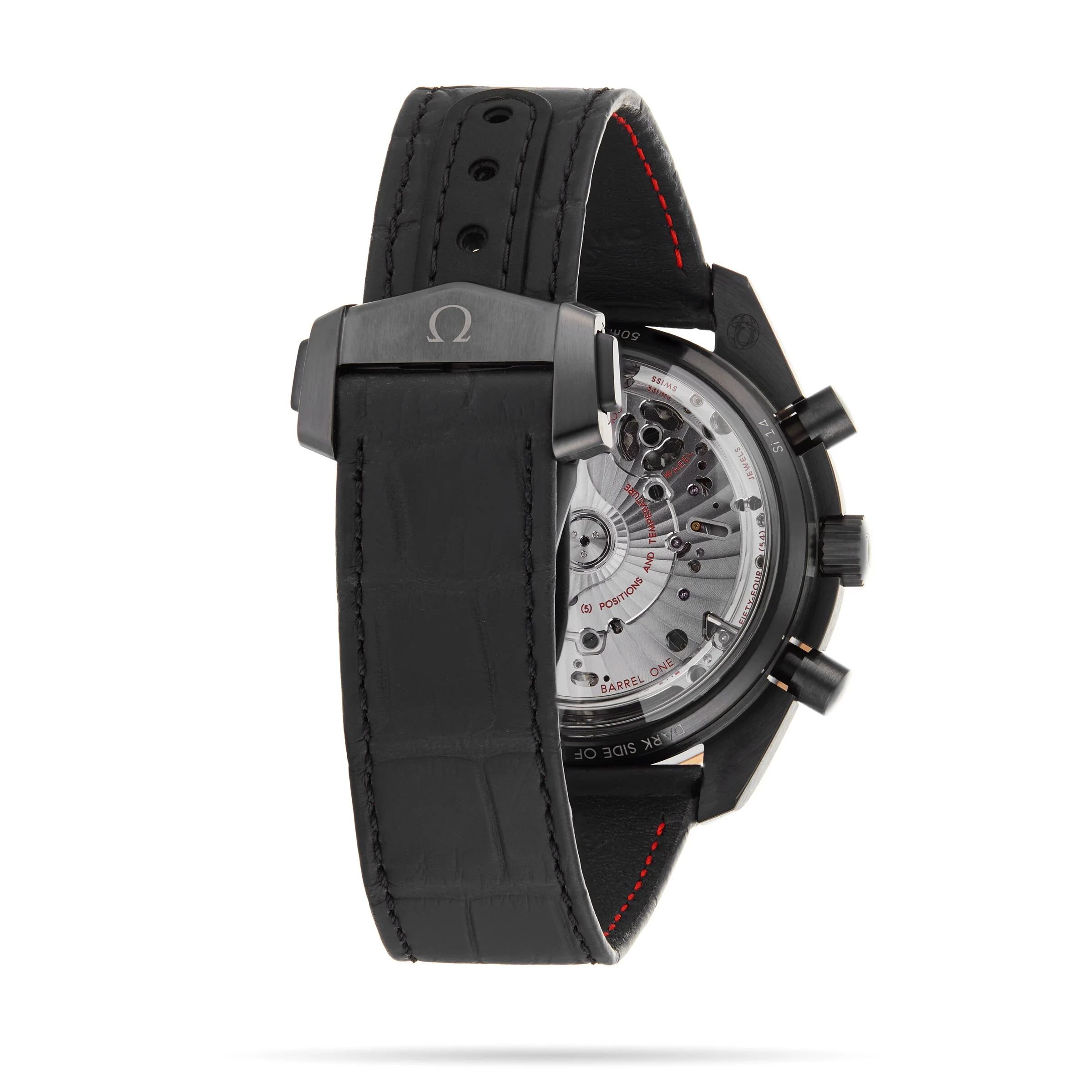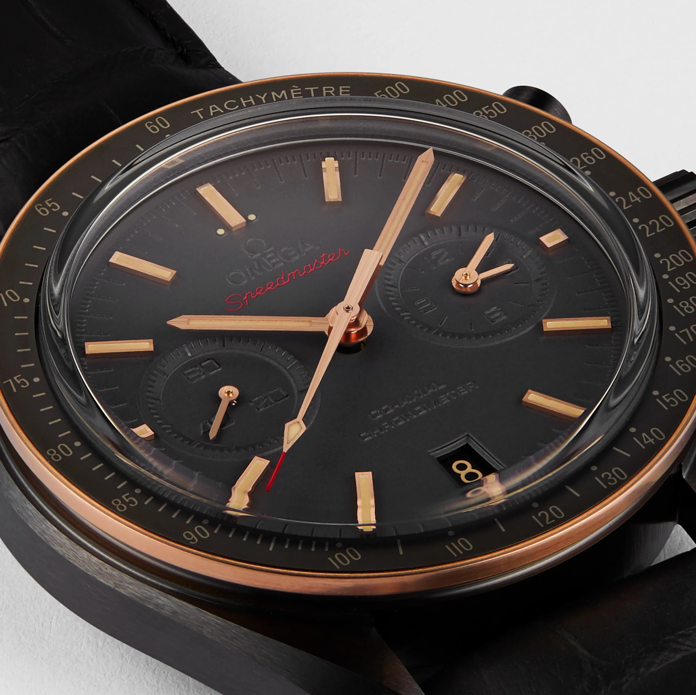 A tribute to the Speedmaster Professional chronographs Inspired by a legacy 44.25mm ceramic case with a black leather strap Features chronograph, chronometer, and tachymeter functions Driven by the 9300 calibre movement THE DARK SIDE OF THE MOON In 1968, the crew of Apollo 8 became the first humans to see the dark side of the moon, orbiting the moon 10 times over 20 hours. The Omega Speedmaster Dark Side Of The Moon pays tribute to the Speedmaster Professional chronographs worn by every Apollo astronaut during this mission. Embodying the brand’s pioneering spirit, this incredible chronograph is inspired by a legacy and crafted from a block of black zirconium oxide ceramic. BLACK SEDNA A 44.25mm brushed black ceramic case with an 18K Sedna™ gold bezel ring, hands, and indexes is presented on a black leather strap. The matt grey dial has been manipulated using laser ablation and is framed by a tachymeter scale. Driven by 9300 Omega calibre movement, this Master Chronometer is certified by MEATS and offers chronograph functions, co-axial escapement, and water resistance up to 5 bar (50 metres).