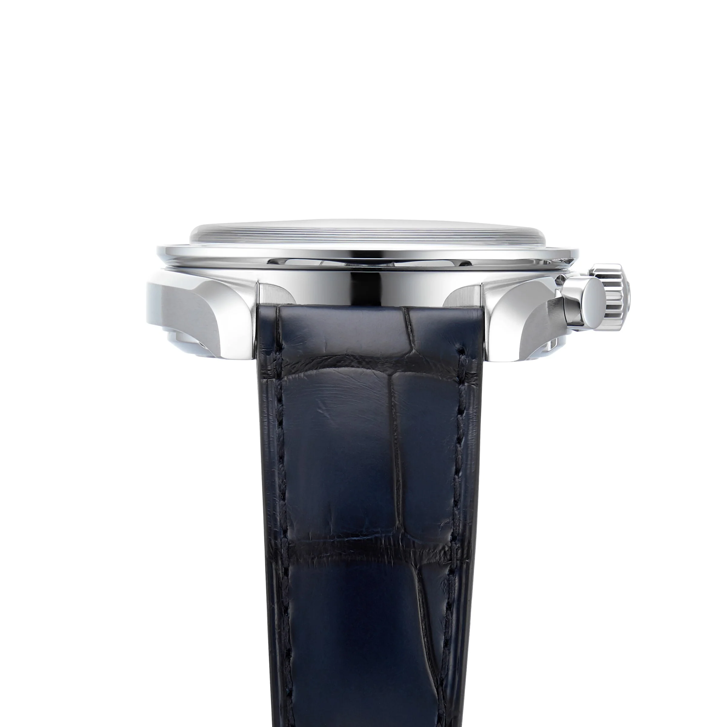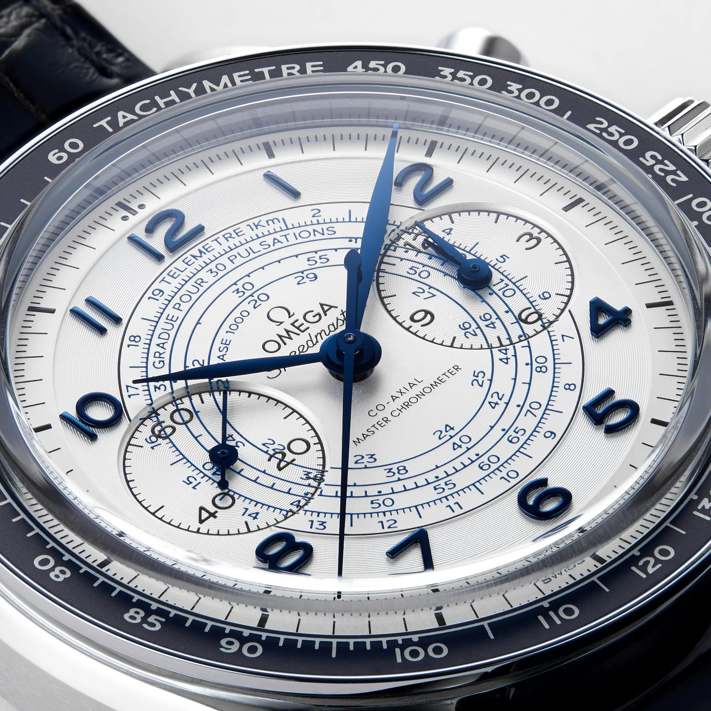Legendary Speedmaster heritage with 1940s inspired design Silver-toned dial with three distinctive timing scales running on a unique spiral track 43mm stainless steel case paired with a blue leather strap Powered by the 9908 calibre movement for ultimate precision Water resistant to 5 bar (50metres) VINTAGE ROOTS, MODERN PERFORMANCE Launched in 1957, Omega’s Speedmaster collection has become truly legendary. The Chronoscope collection takes the iconic model and adds a touch of inspiration from the Omega’s 1940s chronograph watches. The leaf-shaped hands, Arabic numerals, and three snail timing scales provide a distinct nod to the brand’s vintage roots and rich history of chronograph design. HIGH PERFORMANCE DIAL This 43mm watch presents a silver dial, framed by a blue anodized aluminium bezel complete with a tachymeter scale. The stainless steel case is paired with a blue leather strap. The 1940s ‘snail’ design reveals three distinctive timing scales - a tachymeter to measure speed based on distance, a pulsometer to measure heartbeat and a telemeter to measure distance based on the speed of sound. Serving precision, performance and magnetic resistance, this timepiece is driven by the 9908 calibre movement.