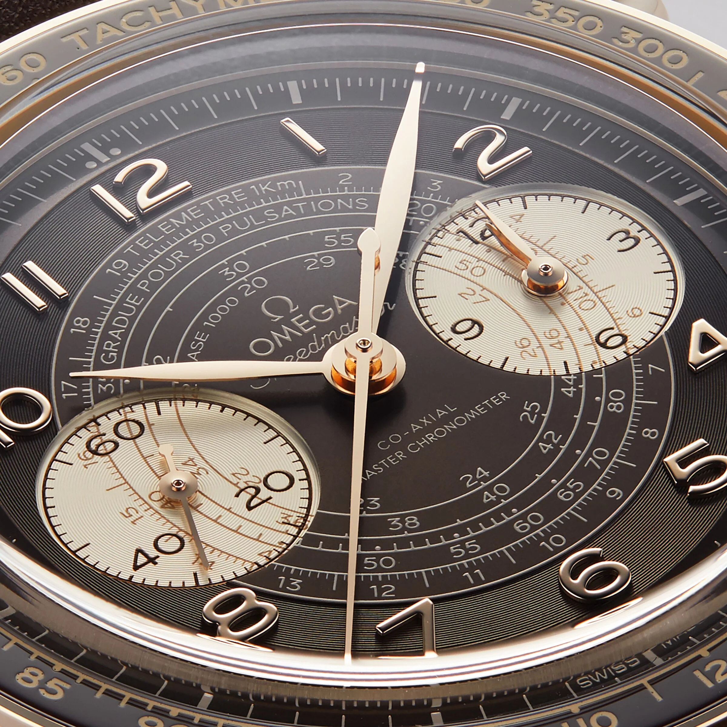 Legendary Speedmaster heritage with 1940s inspired design Oxidised bronze dial with three distinctive timing scales running on a unique spiral track 43mm bronze gold case paired with a brown leather strap Powered by the 9908 calibre movement for ultimate precision Water resistant to 5 bar (50metres) VINTAGE ROOTS Launched in 1957, Omega’s Speedmaster collection has become truly legendary. The Chronoscope collection takes the iconic model and adds a touch of inspiration from the Omega’s 1940s chronograph watches. The leaf-shaped hands and three snail timing scales provide a distinct nod to the brand’s vintage roots and rich history of chronograph design. UNRIVALLED ACCURACY This 43mm model features a classic brown leather strap, paired with a unique, corrosion- resistant case constructed from Omega’s exclusive bronze gold. The oxidised bronze dial features a unique patina and opaline finish, 18K brozne gold PVD coated hands and numerals, and three chronograph scales – a tachymeter scale for measuring speed and distance, a pulsometer scale for measuring the wearer’s pulse, and a Telemeter scale for measuring the distance from something that is audible or visible. Powering the watch, a 9908 calibre movement ensures flawless precision and unrivalled accuracy. Visible through the transparent caseback, the calibre is officially certified by the prestigious Swiss Federal Institute of Metrology (METAS) and is water resistant to 5 bar (50 metres).