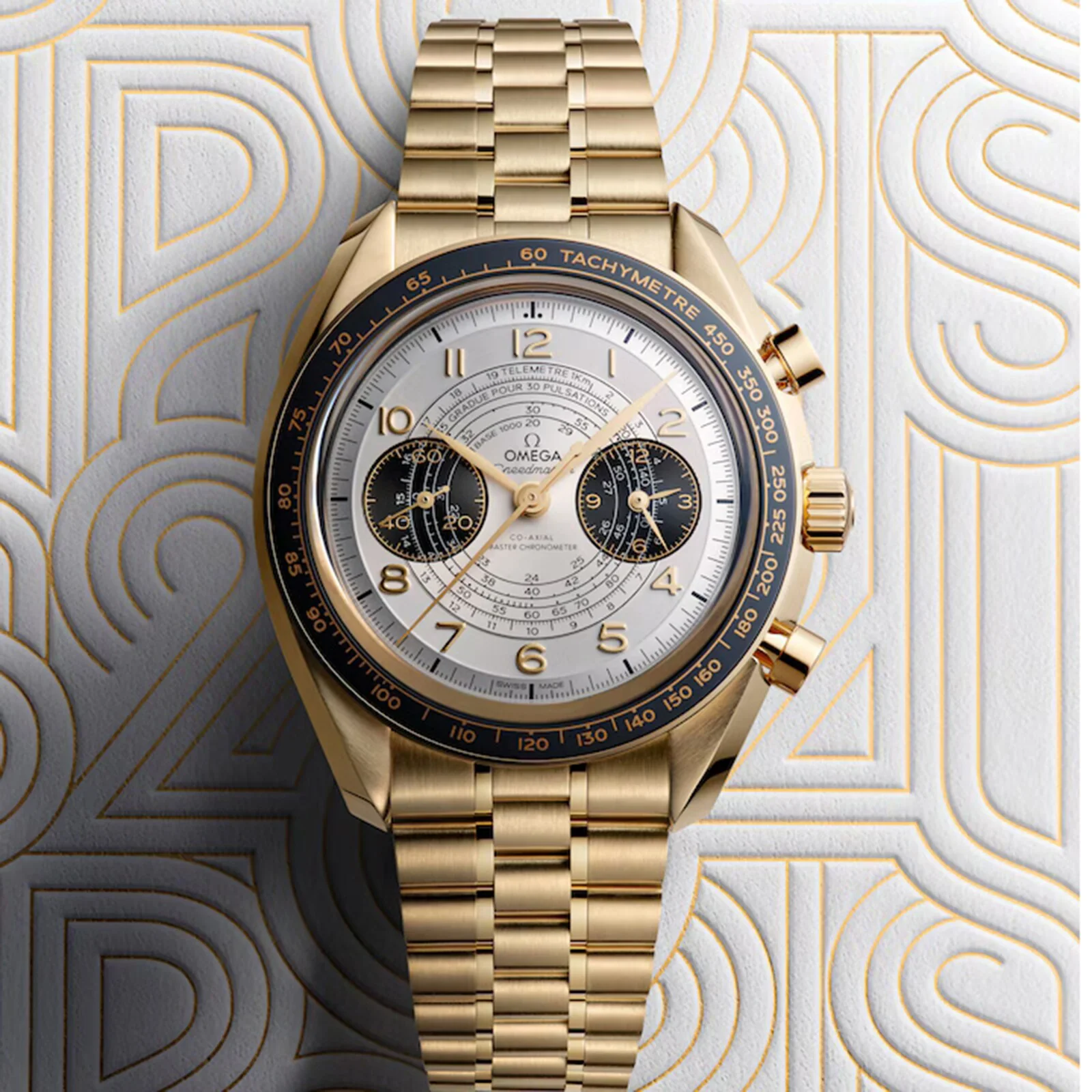 A tribute to the Olympics Games Paris 2024 Presented in a 43mm 18ct yellow gold case and bracelet Silvered dial printed with a tachymeter scale, pulsometer scale, and telemeter scale Powered by Omega's Master Chronometer 9908 calibre movement Water resistant up to 5 bar (50 metres) THE SPEEDMASTER COLLECTION Designed by the creators of the first watch worn on the moon, the Speedmaster collection boasts Omega's most iconic timepieces. Having been part of all six moon landings, this legendary watch captures the heart of the brand's pioneering spirit. Demonstrating the brand's commitment to evolution, this new edition, offers even more reliability, precision and excellence. AN OLYMPIC TRIBUTE Presented on an 18ct yellow gold bracelet, this master chronometer boasts a 43mm 18ct yellow gold case with the stamped words 'Paris 2024' alongside the Olympic rings, paying tribute to the Olympic Games in Paris 2024. The silvery white opaline dial displays blackened sub dials and is framed by a black anodized aluminium bezel ring with tachymeter scale. Arabic numerals and leaf shaped hands in 18ct Moonshine™ Gold, further enhance the dial alongside a printed pulsometer and telemeter scale. Driven by Omega's Master Chronometer 9908 calibre movement, this timepiece offers water resistance to 5 bar (50 metres) and is equipped with a small seconds counter and a 60 minute and 12-hour recorder.