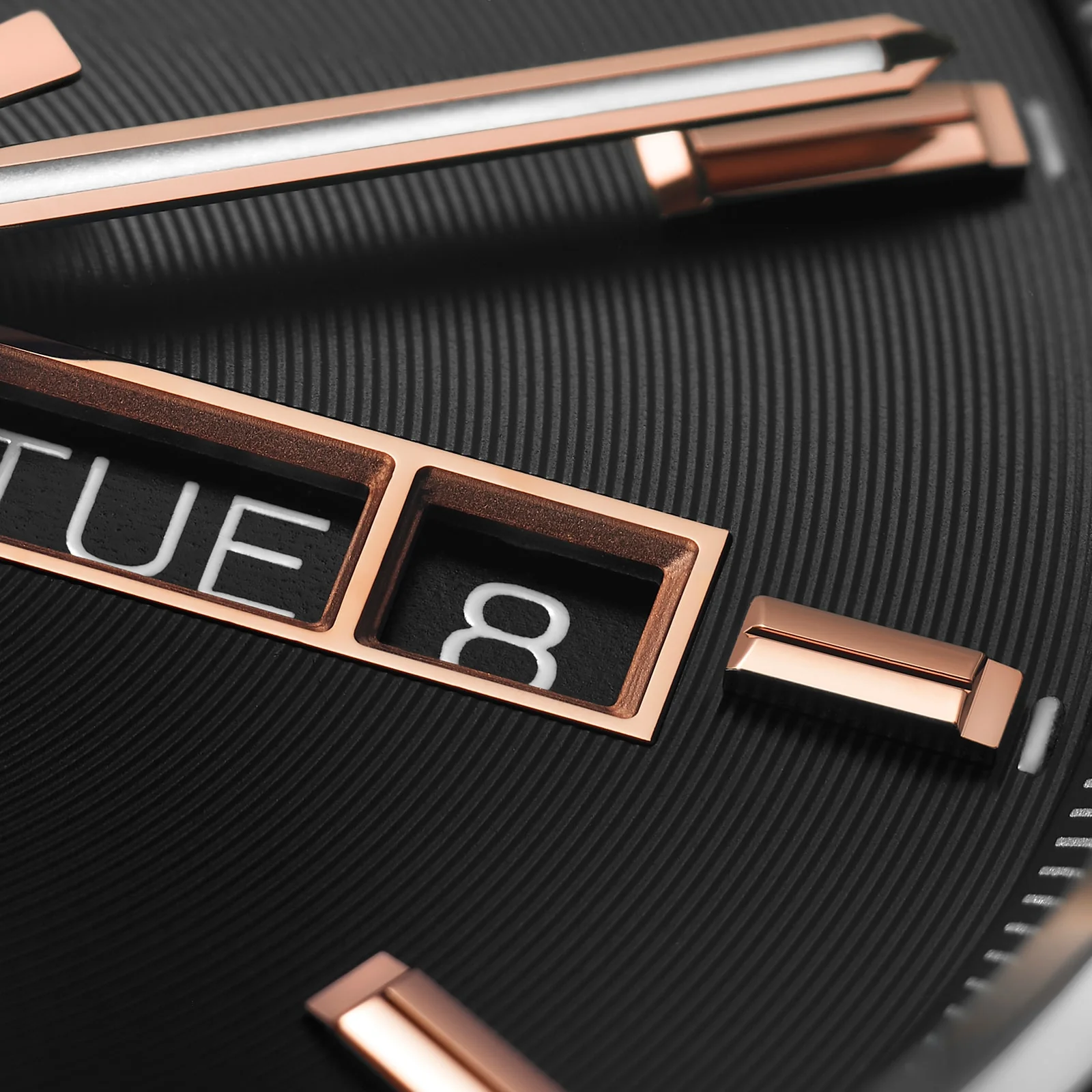 Carrera – embracing the spirt of endurance An elegant classic that’s ready for anything 41mm steel case with an updated steel bracelet Bold black dial with 18K rose gold plated details and a day-date display Driven by the calibre 5 automatic movement for exceptional reliability A STATEMENT OF ELEGANCE Born on the racetracks in 1963, the Carrera collection embraces the spirit of endurance and outstanding performance. Designed for professional drivers, yet with an elegant sense of style, the collection pays tribute to the infamous Carrera Panamericana race. This Carrera 41mm model makes a strong impression, with distinctive looks and proud reliability. The bold lines of the steel case reflect strength of character, while the calibre 5 automatic movement delivers endless functionality, and the black and gold tones create a striking luxury aesthetic. FUNCTION AND FORM This 41mm timepiece makes a statement of elegance with its iconic round case and ergonomic bracelet, designed to optimise comfort. The bold black dial presents 18K rose gold plated hands and indexes, both filled with Super-LumiNova® for improved visibility in all conditions, as well as a day-date display at 3 o’clock. Incredible precision and reliability are provided by the calibre 5 automatic movement, which also offers a 38-hour power reserve.