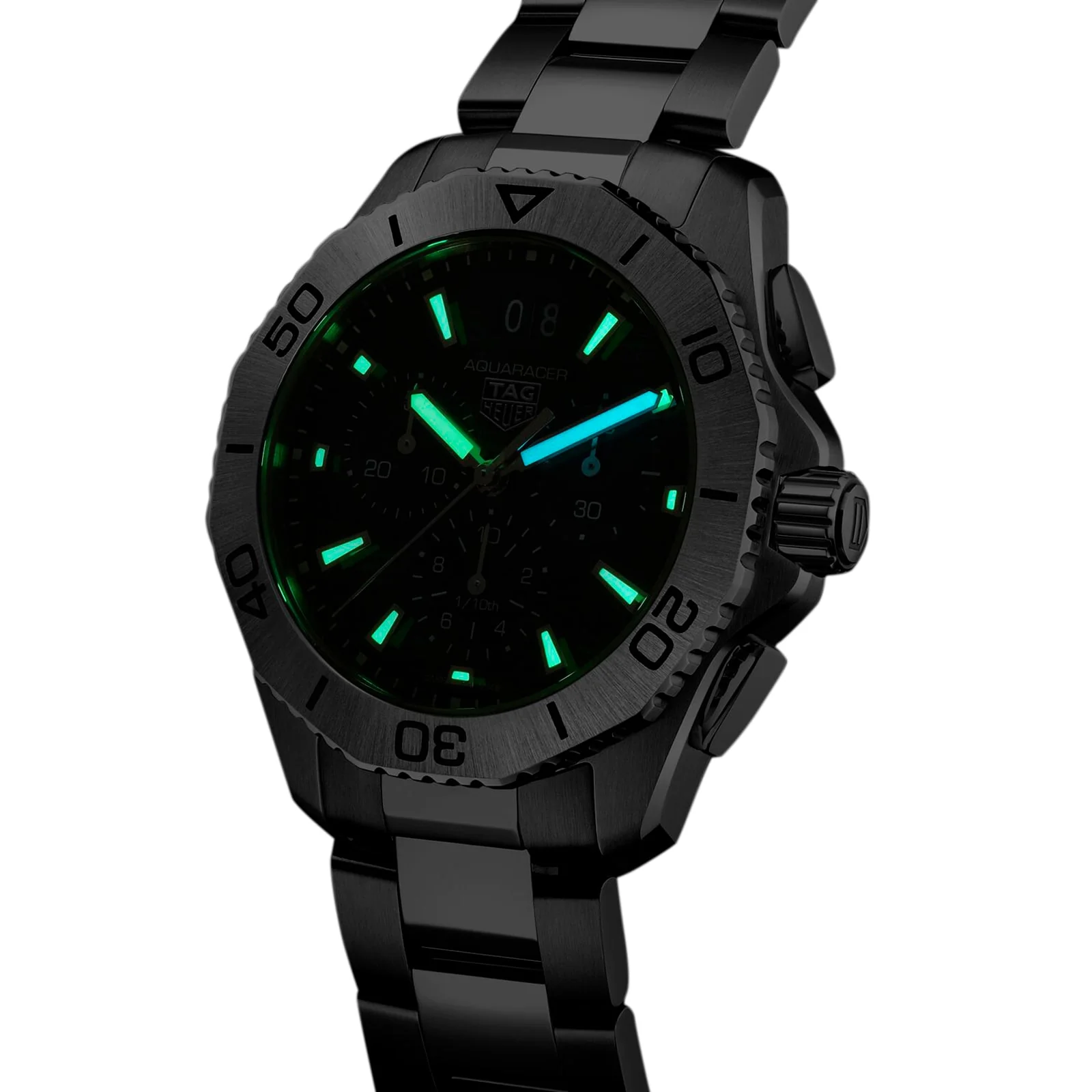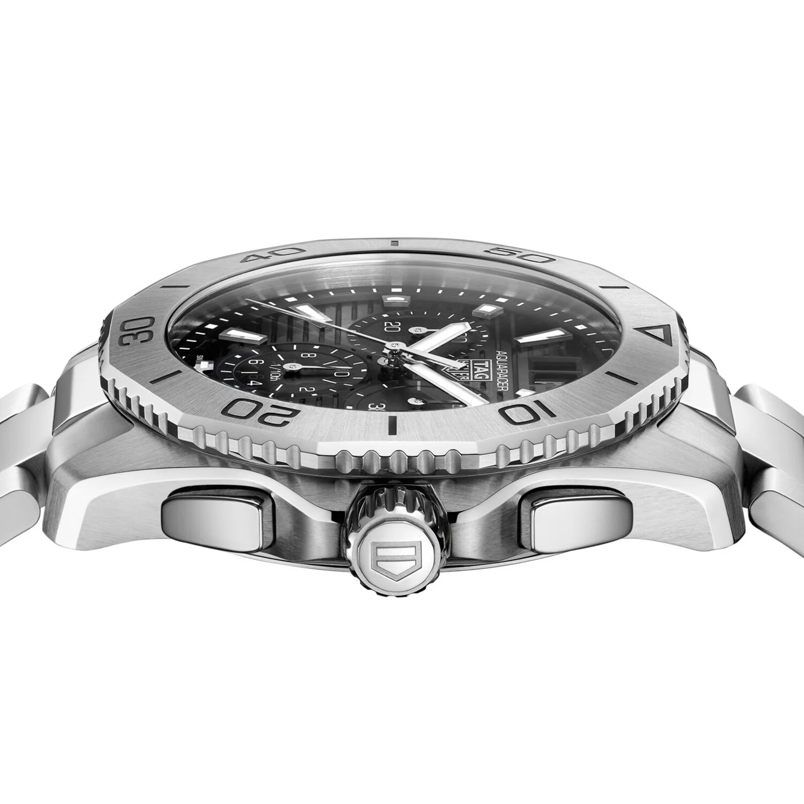 Aquaracer- the ultimate outdoor watch Presented in a 40mm steel case with a co-ordinating bezel Powered by quartz chronograph movement Black dial with three sub-dials and applied indexes Complete with water resistance to 20 bar (200 metres) THE STORY CONTINUES Re-launched in 2021, the Aquaracer collection has rewritten sports watch design and performance codes to take wearers beyond the edge as they push their limits in search of ever-greater performance. The TAG Heuer Aquaracer Professional 200 is the latest chapter in the story of this iconic collection. Clean and colourful, this model is the ultimate go-anywhere watch, designed to cross time zones and dive and surf all over the world. Combining a fresh and sporty style with extreme technical construction, this high-performance timepiece is characterised by an extreme 40mm case featuring 20 bar (200 metres) of water resistance. PRECISION AND RELIABILITY This Aquaracer model features a 40mm steel case with a coordinating bracelet and bezel. The black dial showcases three sub-dials and silver-plated applied hands and indexes. Powered by quartz chronograph movement, this timepiece offers superior accuracy in addition to its sleek design.