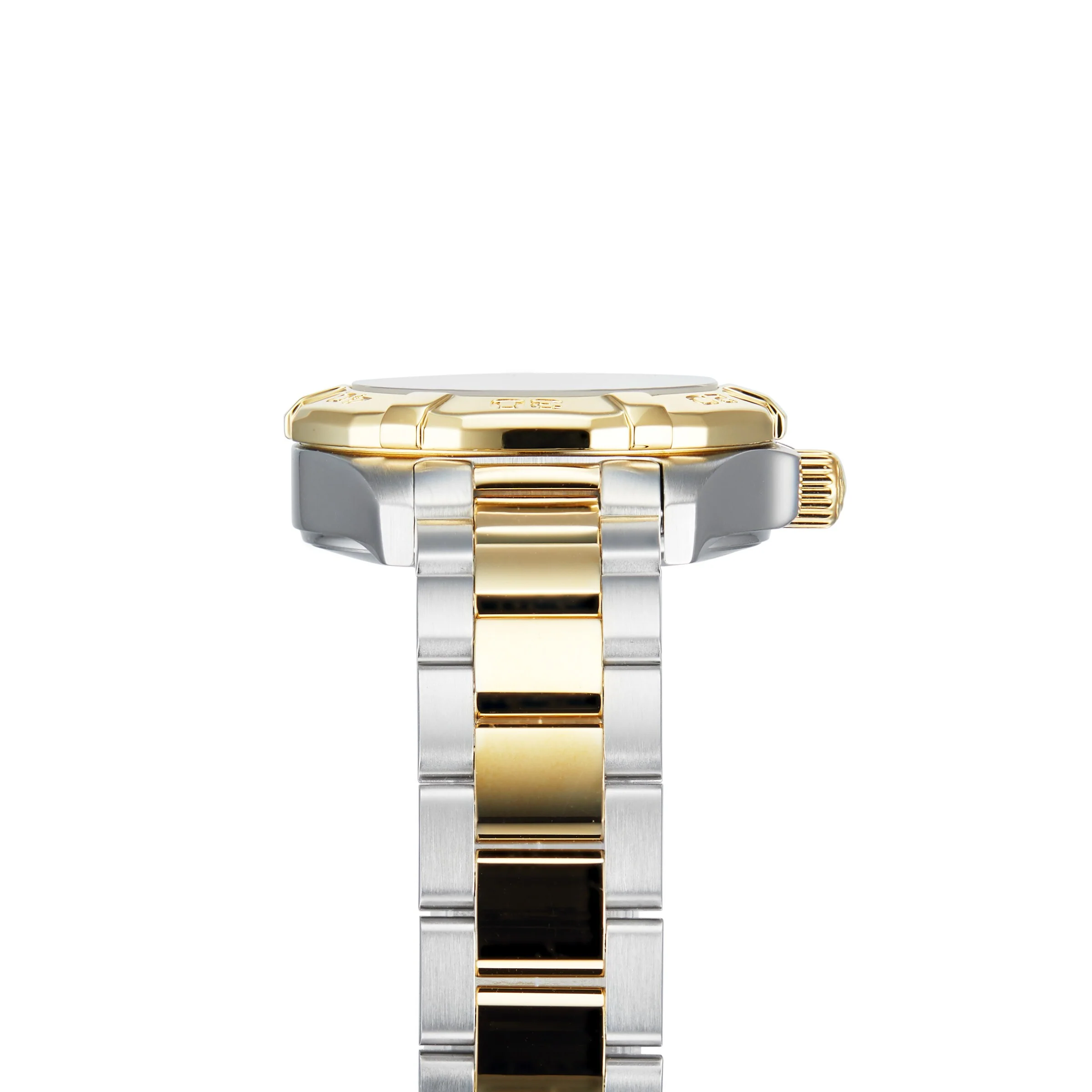Aquaracer – pushing limits in search of greater performance Refined elegance with a sporting pedigree Petite 27mm stainless steel and 18K 2N yellow gold plated case with a gold-plated bezel Ethereal white mother-of-pearl dial with 11 diamond indexes Powered by precise Quartz movement REFINED ELEGANCE WITH A SPORTING PEDIGREE Re-launched in 2021, the Aquaracer collection has re-written sports watch design and performance codes to take wearers beyond the edge as they push their limits in search of ever greater performance. This petite, Aquaracer 300 27mm model updates the collection’s sporting pedigree with elegant touches, including a stainless steel and 18K 2N gold-plated case, and a refined white mother-of-pearl dial with 11 glistening diamond hour markers. ICONIC ELEGANCE Showcasing a gentle case profile, this luxurious model combines 18K 2N gold with glistening diamonds. Powered by a reliable Quartz movement, the mother-of-pearl dial presents gold-plated hands and a date display at 3 o’clock. Water resistance to 30 bar (300 metres) and an extendible diving bracelet ensure that this timepiece is as functional as it is visually striking.
