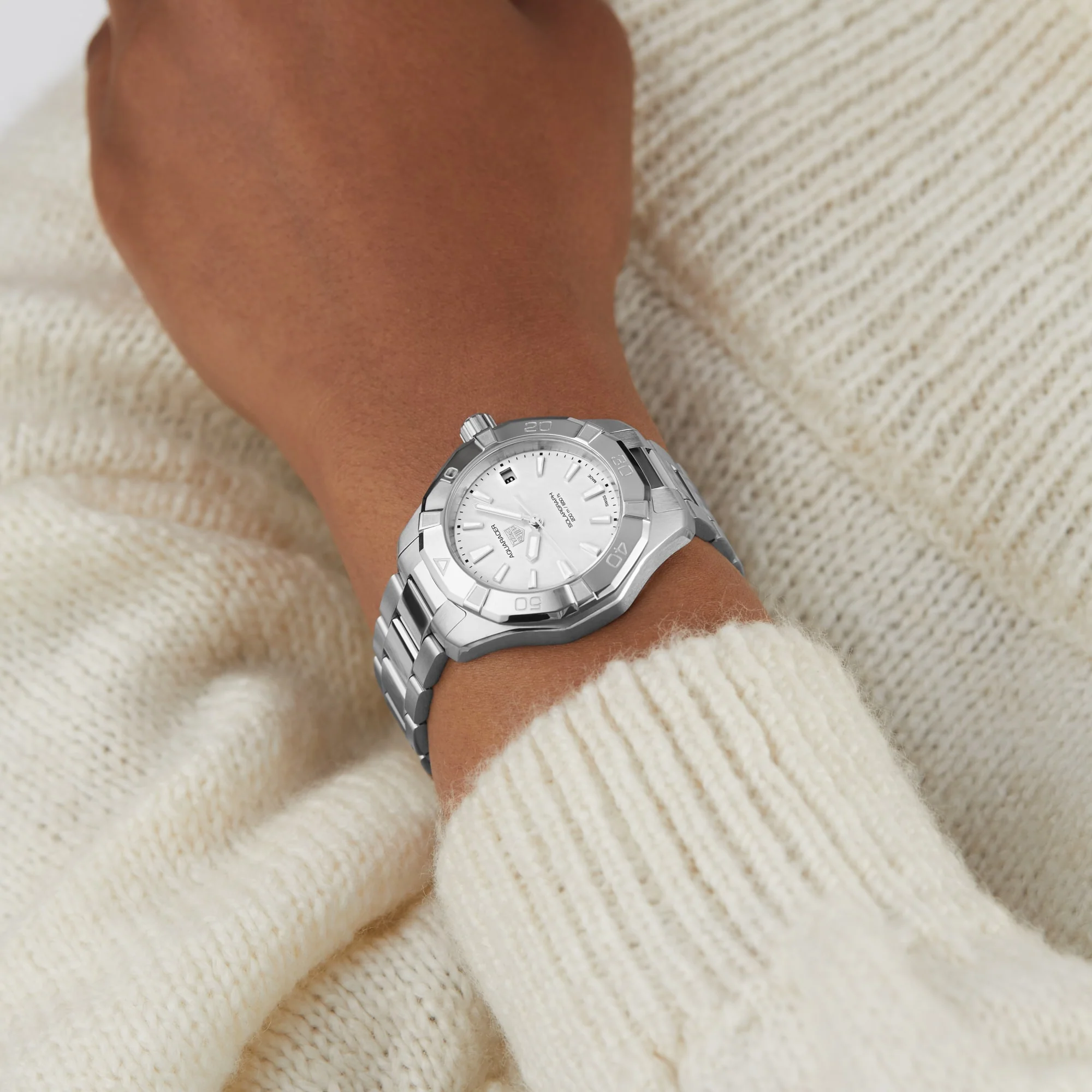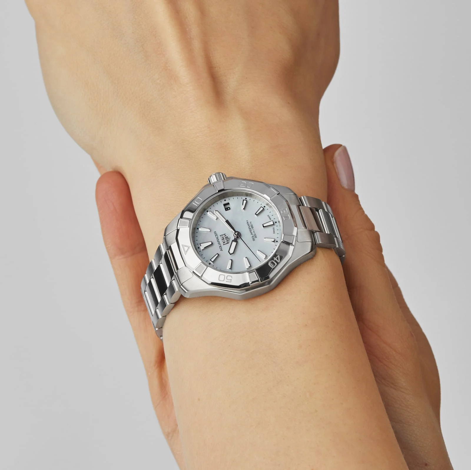 Aquaracer - pushing limits in search of greater performance Crafted for adventure Icy white mother-of-pearl dial embraces the beauty of the Northern Lights Housed in a slim 34mm case crafted from fine-brushed and polished steel Powered by the calibre TH50- 01 quartz movement, which recharges with the sun or artificial light RUGGED ADVENTURES MEET URBAN SOPHISTICATION Re-launched in 2021, the Aquaracer collection has re-written sports watch design and performance codes to take wearers beyond the edge as they push their limits in search of ever-greater performance. The Aquaracer Professional 200 collection unites robust construction with boldness of design. This Solargraph model is the first ever solar-powered timepiece from the brand. A new take on time keeping, this standout watch features an innovative Solargraph module, allowing it to harness the energy of any source of light, whether it's the sun or an artificial light source, for uninterrupted power and exceptional performance, day and night. THE MAGIC OF THE NORTHERN LIGHTS This 34mm model pairs a fine-brushed and polished steel case with a co-ordinating three-row bracelet and a 60- minute scale bezel featuring re-designed riders. Inspired by the northern lights illuminating nights in the Arctic Circle, the shimmering polar white mother-of-pearl dial is highlighted with rhodium-plated indexes and hands. Water resistant to 200 metres, this unique timepiece is driven by Solargraph technology and the calibre TH50-01 quartz movement for limitless power.