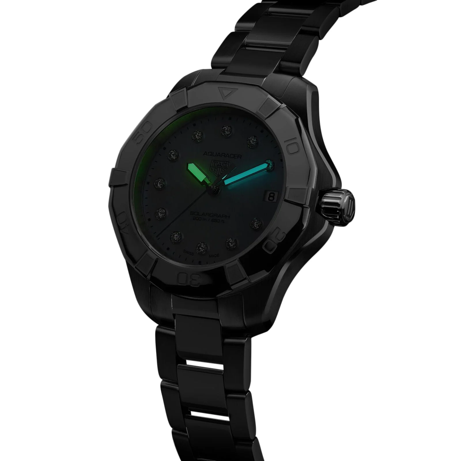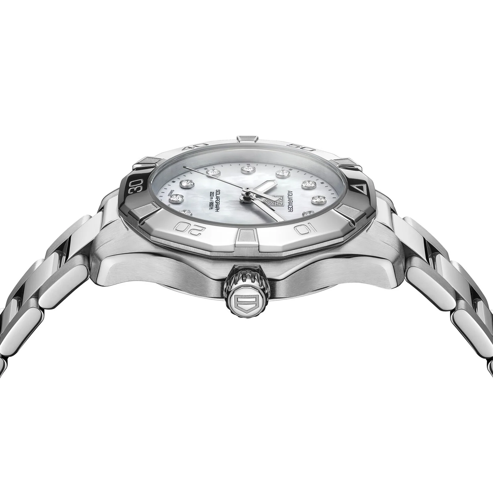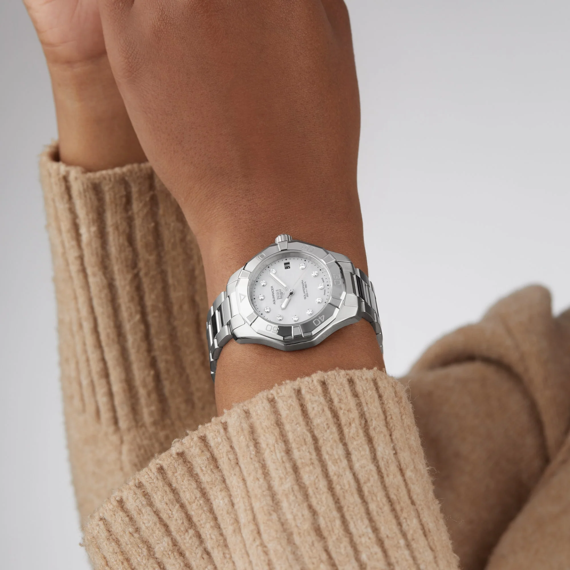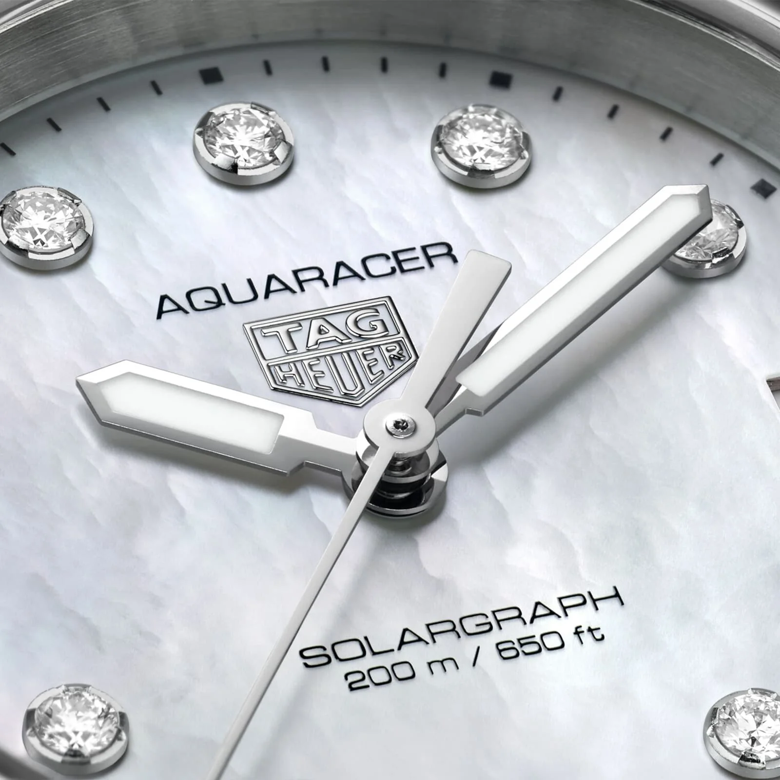 Aquaracer - pushing limits in search of greater performance Unparalleled sophistication meets enduring resilience Radiant mother-of- pearl dial elevated with 11 glistening diamonds/li> Housed in a slim 34mm case crafted from fine-brushed and polished steel Powered by the calibre TH50-01 quartz movement, which recharges with the sun or artificial light THE POWER OF THE SUN Re-launched in 2021, the Aquaracer collection has re-written sports watch design and performance codes to take wearers beyond the edge as they push their limits in search of ever-greater performance. The Aquaracer Professional 200 collection unites robust construction with boldness of design. This Solargraph model is the first ever solar-powered timepiece from the brand. A new take on time keeping, this standout watch features an innovative Solargraph module, allowing it to harness the energy of any source of light, whether it's the sun or an artificial light source, for uninterrupted power and exceptional performance, day and night. UNPARALLELED SOPHISTICATION MEETS ENDURING RESILIENCE This beautiful 34mm model pairs a fine-brushed and polished steel case with a co- ordinating tapered steel bracelet and a 60-minute-scale unidirectional bezel with the brand's redesigned riders. Adding a touch of opulence to the captivating aesthetic, the luminous mother-of-pearl dial is elevated by 11 diamond indexes. Water resistant to 200 metres, this unique timepiece is driven by Solargraph technology and the calibre TH50-01 quartz movement for limitless power.