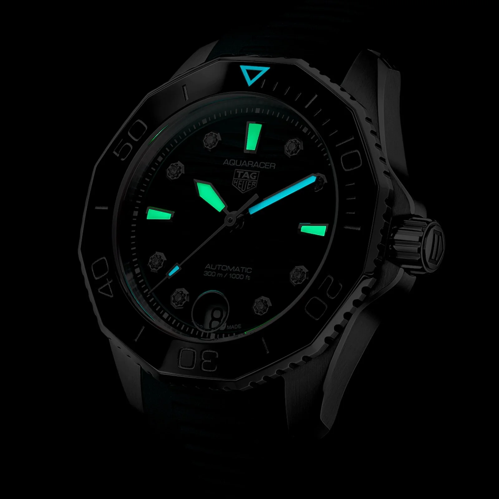 Aquaracer – pushing limits in search of greater performance A true diving watch inspired by the beauty of nature Refined 36mm stainless steel case with a versatile rubber strap Vivid blue lagoon dial with a waved pattern and glistening diamond hour markers Powered by the automatic calibre 5 movement THE BEAUTY OF NATURE Re-launched in 2021, the Aquaracer collection has re-written sports watch design and performance codes to take wearers beyond the edge as they push their limits in search of ever-greater performance. The Aquaracer Professional 300 collection raises the bar for versatility and aesthetic brilliance. Offering an elegant take on the ultimate dive watch, the 36mm stainless steel case embraces sharp geometry, while the blue lagoon dial with a waved pattern and glistening diamond hour markers draws inspiration from the refreshing waters of lagoons and coral reefs. PERFORMANCE UNDER PRESSURE This striking 36mm model pairs a slim, stainless steel case with a co-ordinating steel bracelet, secured by safety push buttons. The eye-catching blue dial is enhanced by 8 glistening diamond hour markers, alongside luminescent hands and a date display at 6 o’clock. Incredible precision is provided by the calibre 5 automatic movement, while water resistance to 30 bar (300 metres) further enhances performance and a 60-minute scale keeps track of the elapsed dive time.