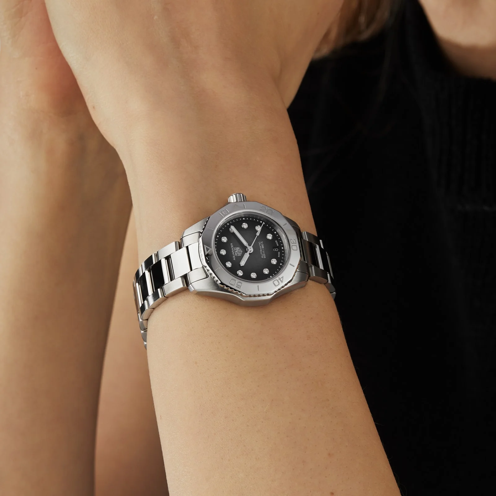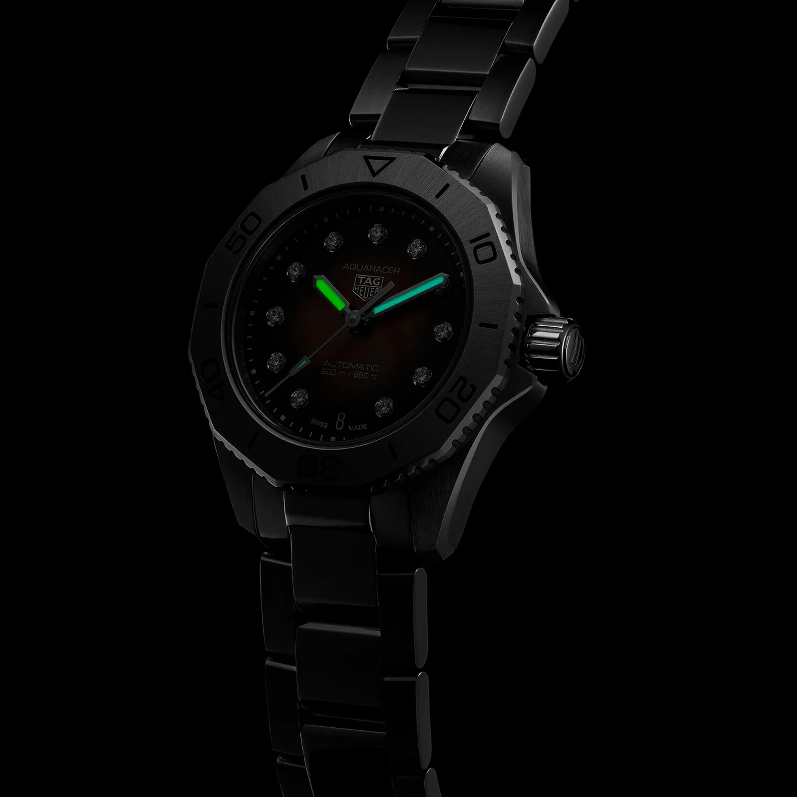 Aquaracer – pushing limits in search of greater performance Robust construction and bold design Refined 30mm stainless steel case with a co-ordinating bracelet Striking black mother-of-pearl dial with glistening diamond hour markers Powered by the automatic calibre 9 movement AN ESSENTIAL ALLY Re-launched in 2021, the Aquaracer collection has re-written sports watch design and performance codes to take wearers beyond the edge as they push their limits in search of ever-greater performance. The Aquaracer Professional 200 collection unites robust construction with boldness of design. Prestigious and resilient, the 30mm stainless steel case embraces refined ergonomics and finishes, while the smokey black mother-of-pearl dial with glistening diamond hour markers makes an adrenaline-fuelled statement. DEVINE DETAILS This 30mm model pairs a stainless steel case with a co-ordinating steel bracelet. The ethereal, smokey black mother-of-pearl dial is enhanced by 11 glistening diamond hour markers, alongside luminescent hands and a date display at 6 o’clock. The reliable calibre 9 automatic movement offers incredible precision that will take you further than ever, while water resistance to 20 bar (200 metres) further enhances performance.