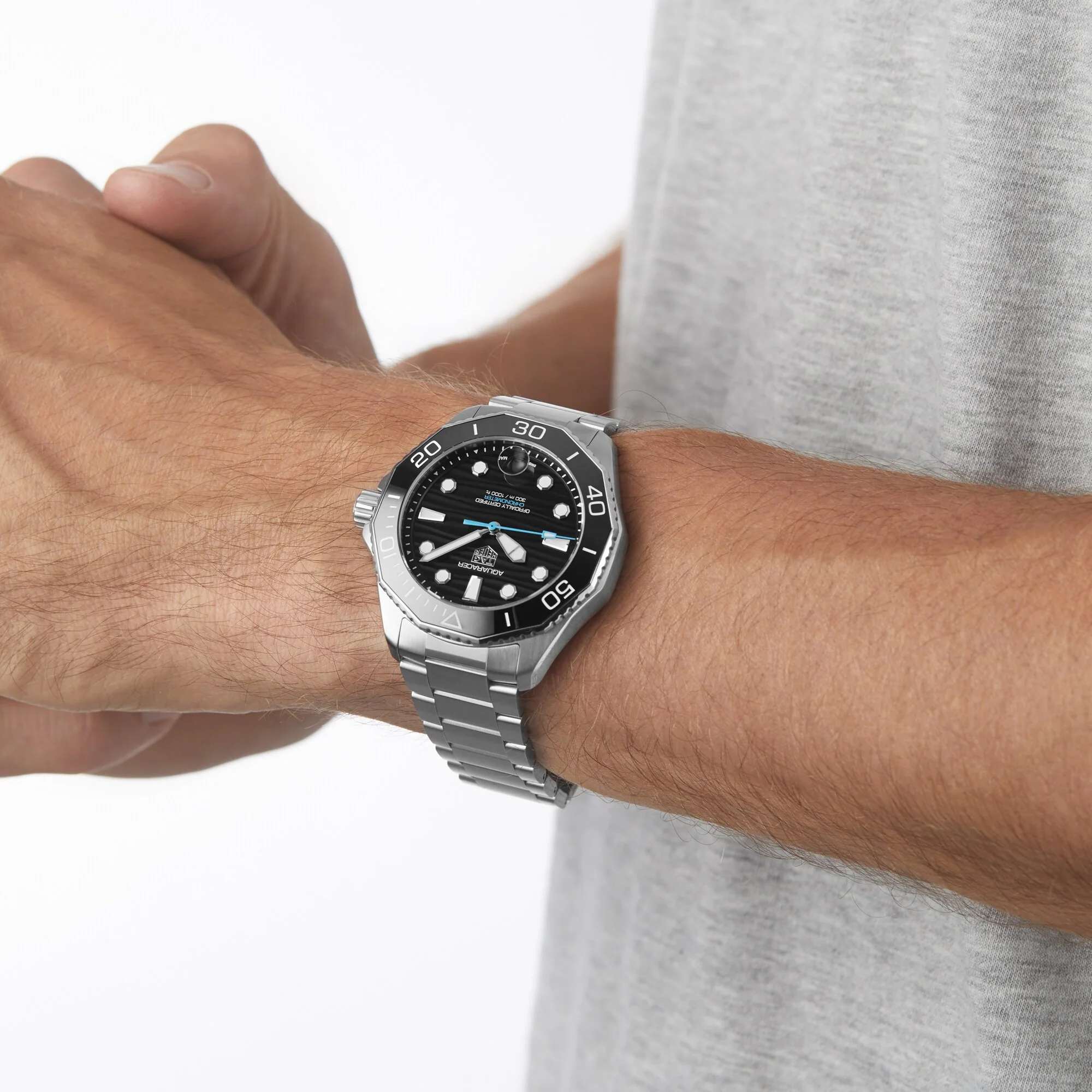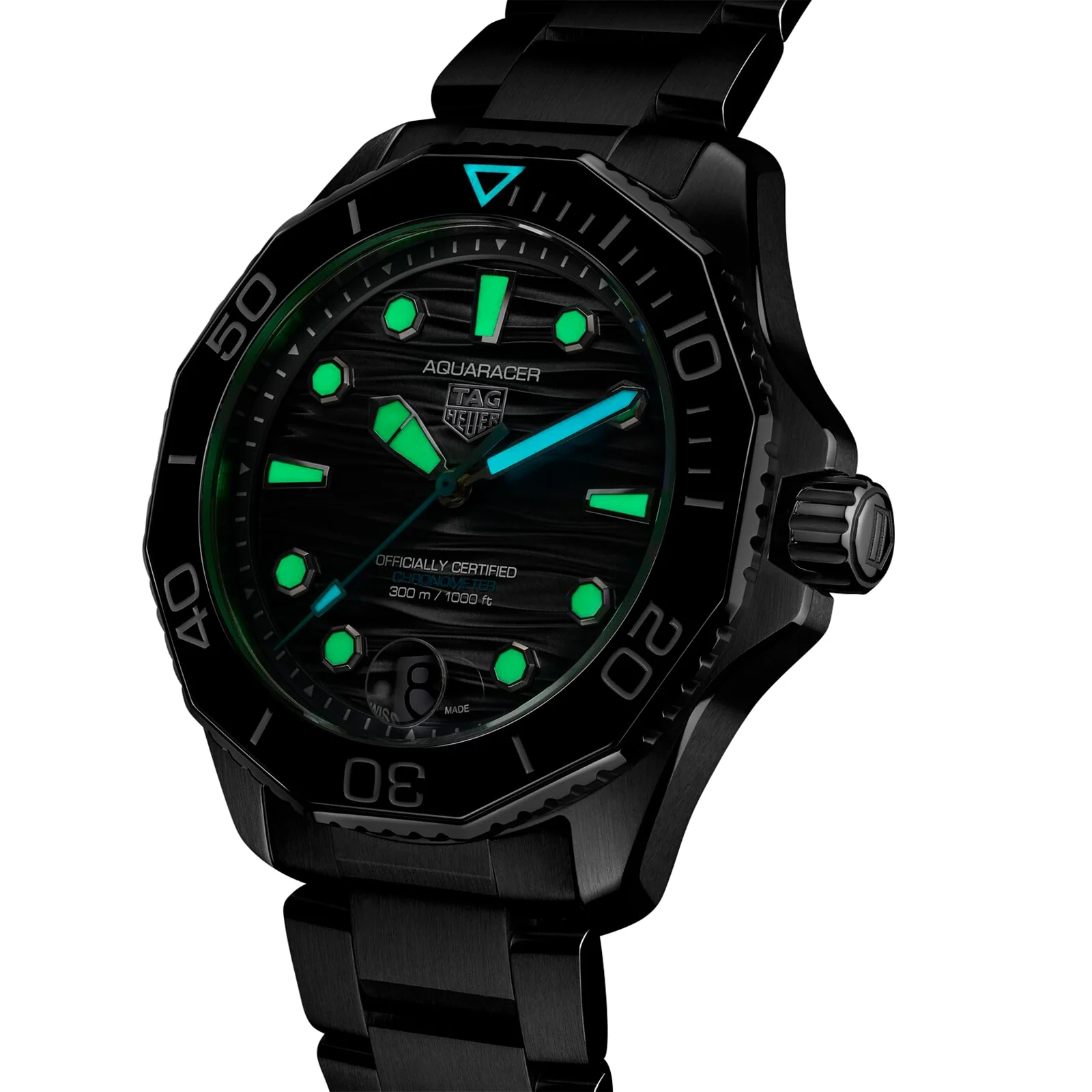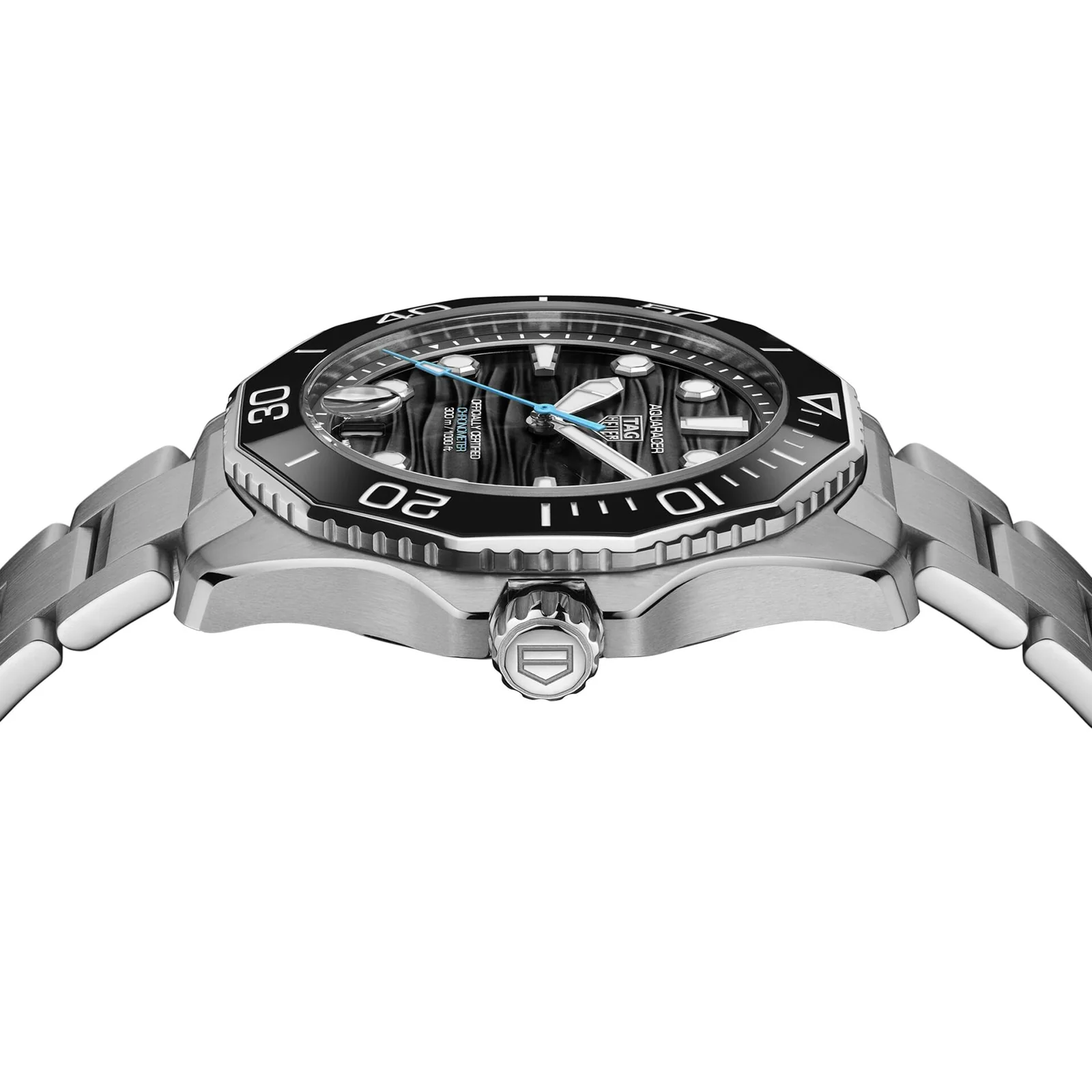 Aquaracer Professional 300 Date - engineered for deep-sea exploration and precision Part of the TAG Heuer Aquaracer collection Robustly designed with a 42mm fine-brushed and polished stainless steel case A striking black dial with a wavy pattern, illuminated by luminous white Super-LumiNova® indexes and hands Powered by automatic movement, equipped with an 80-hour power reserve EXPERTLY ENGINEERED Since 1860, TAG Heuer has set the standard in luxury chronograph watches, capturing performance to the fraction of a second. The brand's innovations, from the Mikrograph to the luxury Connected watch, highlight its commitment to precision and cutting-edge technology. The Aquaracer collection exemplifies this commitment with its blend of elegance and functionality, designed for those who want to combine their love of water sports with an appreciation for the finer things in life. Each Swiss- made watch showcases unmatched accuracy and style, embodying the brand's relentless pursuit of excellence in watchmaking. SEA READY Looking for a watch that can keep up with your deep-sea adventures? Meet the TAG Heuer Aquaracer Professional 300. At 42mm, the dial is a work of art. Black waves dance across its surface, reminiscent of the ocean depths. Luminous white indexes and hands cut through the darkness, while a light blue central hand adds a colourful touch. Wrapped in a steel case and accented by a black ceramic bezel, this isn't just for show - it's your 60-minute countdown to whatever needs timing. The steel three-row bracelet is built to stay put. With a folding clasp and double safety push-buttons, it's secure whether you're 300 metres down or just showing off at the surface.