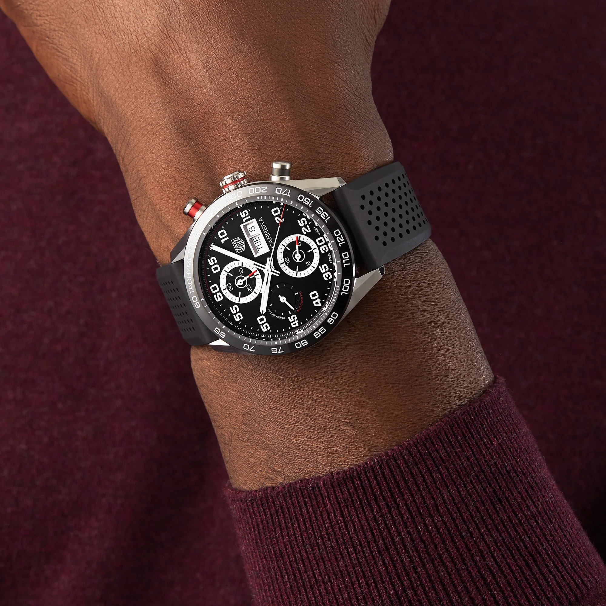 Carrera – embracing the spirt of endurance A revamped classic Confident 44mm steel case with a new perforated rubber strap Black dial sporty red touches and numerals and text in a bold new font Driven by the calibre 16 automatic movement for ultimate precision and reliability AN UPDATED ICON Born on the racetracks in 1963, the Carrera collection embraces the spirit of endurance and outstanding performance. Designed for professional drivers, yet with an elegant sense of style, the collection pays tribute to the infamous Carrera Panamericana race. This revamped take on a classic icon makes a confident statement, with distinctive looks and proud reliability. The bold black dial is enhanced by sporty red touches, while the numerals and text are presented in a bold new font. BOLD CONVICTION Exuding a distinct air of confidence, the new 44mm steel case is equipped with a ceramic bezel and secured with a new perforated rubber strap, adding to the sports-luxe style. The assertive black dial is ready for anything, with rhodium- plated hands and indexes, both filled with Super-LumiNova® for improved legibility, as well as a day-date display at 3 o’clock, and three chronograph sub-dials. Refusing to compromise on performance, the calibre 16 automatic movement offers a 42-hour power reserve and water resistance to 10 bar (100 metres).