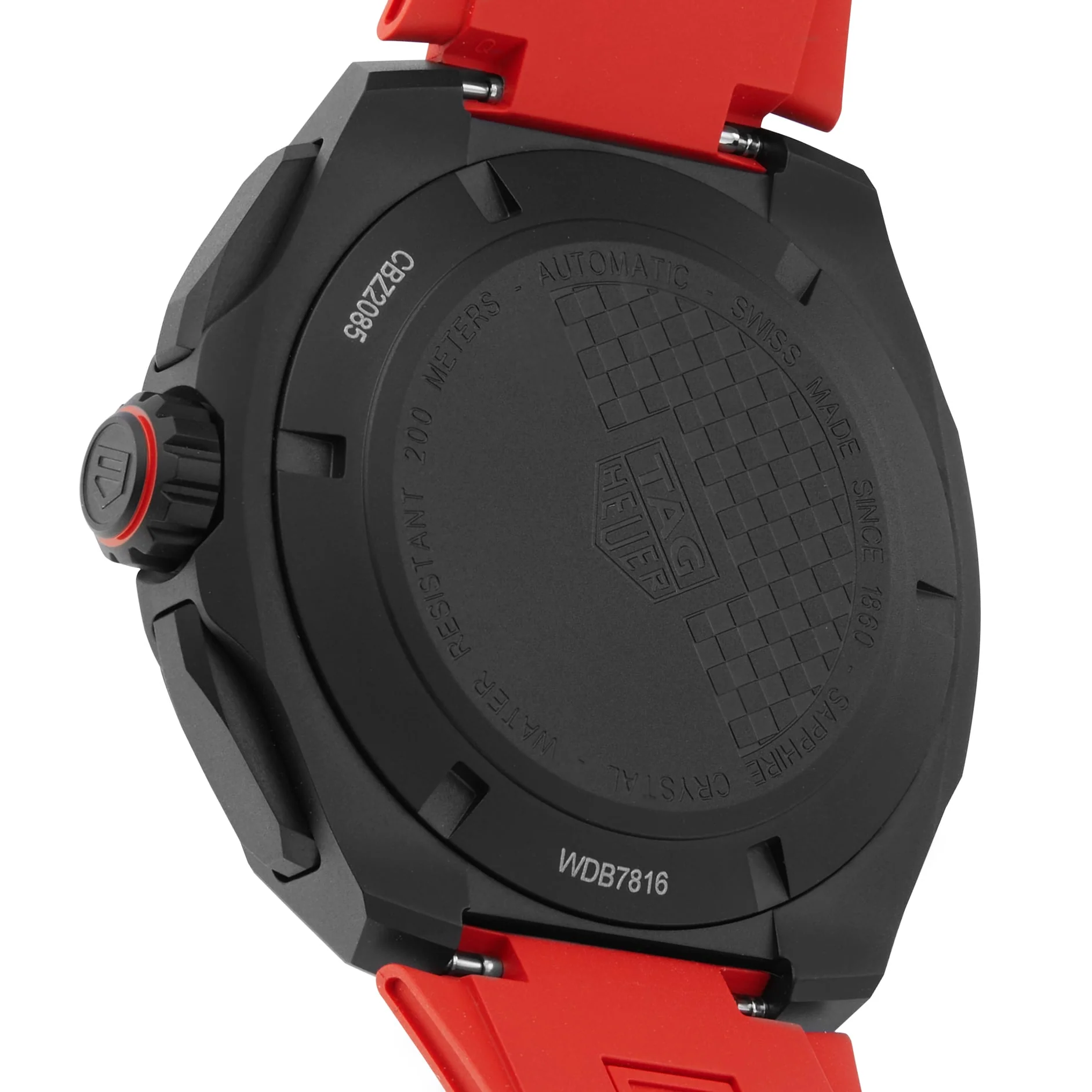 Inspired by the intensity of racing, the TAG Heuer Formula 1 Chronograph in 44 mm is crafted for true racing enthusiasts. The sleek Grade 2 titanium case and vibrant red accents make this timepiece a bold statement on and off the track. The black opalin dial is energised by a red lacquered track, evokes the kinetic speed of a race. Its luminescent hands and indexes provide optimal readability, even in low light conditions. The sandblasted Grade 2 titanium case ensures a robust build. Water resistance up to 200 metres and a red rubber strap make it versatile enough for any adventure. Equipped with the Calibre 16 automatic movement, the chronograph ensures high performance and accuracy. The Grade 2 titanium push buttons and crown complete the dynamic design, reflecting the watch's racing pedigree.