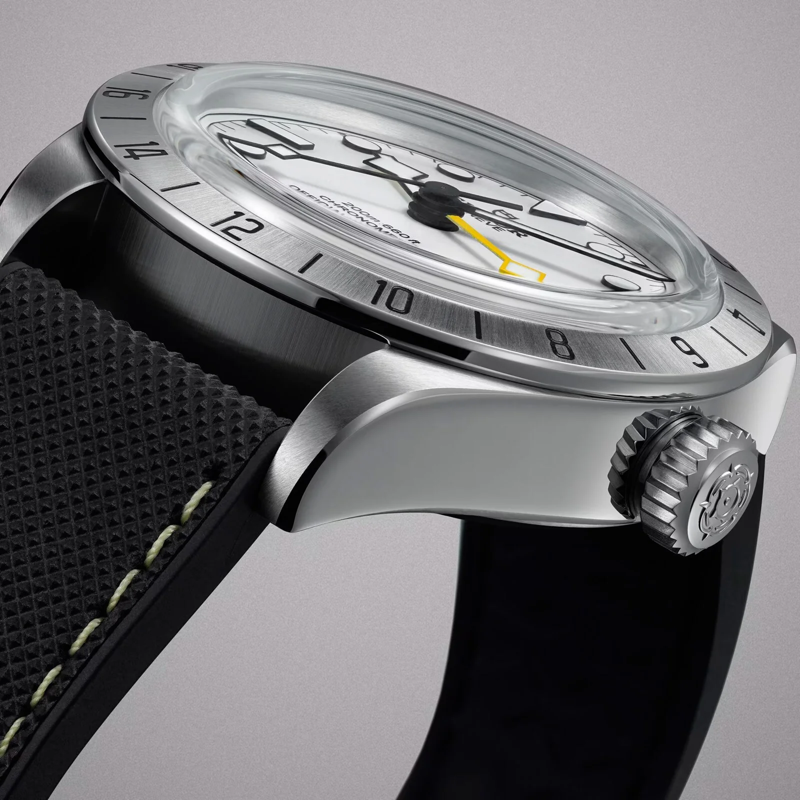 The Black Bay Pro is a robust watch featuring a 24-hour graduated satin-brushed fixed bezel and a yellow 24-hour "Snowflake" hand, all powered by the TUDOR Manufacture Calibre MT5652 with a built-in GMT function. Now the design is pushed even further, with an opaline dial that boosts legibility. The ceramic markers are outlined in black, as are the hands, to create a bold contrast that bolsters the design, making it suitable for any type of exploration, whether polar or subterranean. Reference time is indicated by an angular yellow "Snowflake" hand, an aesthetic hallmark of TUDOR, which completes a lap of the dial every 24 hours. Local time is indicated by another, shorter "Snowflake" hand set by a jumping hour, which can be moved either backwards or forwards. The date, displayed through an aperture positioned at 3 o'clock, is coupled with the local time hand so that when setting the time and passing midnight in retrograde, it instantly jumps to the previous day. A highly unusual, sophisticated and particularly practical function for the user.