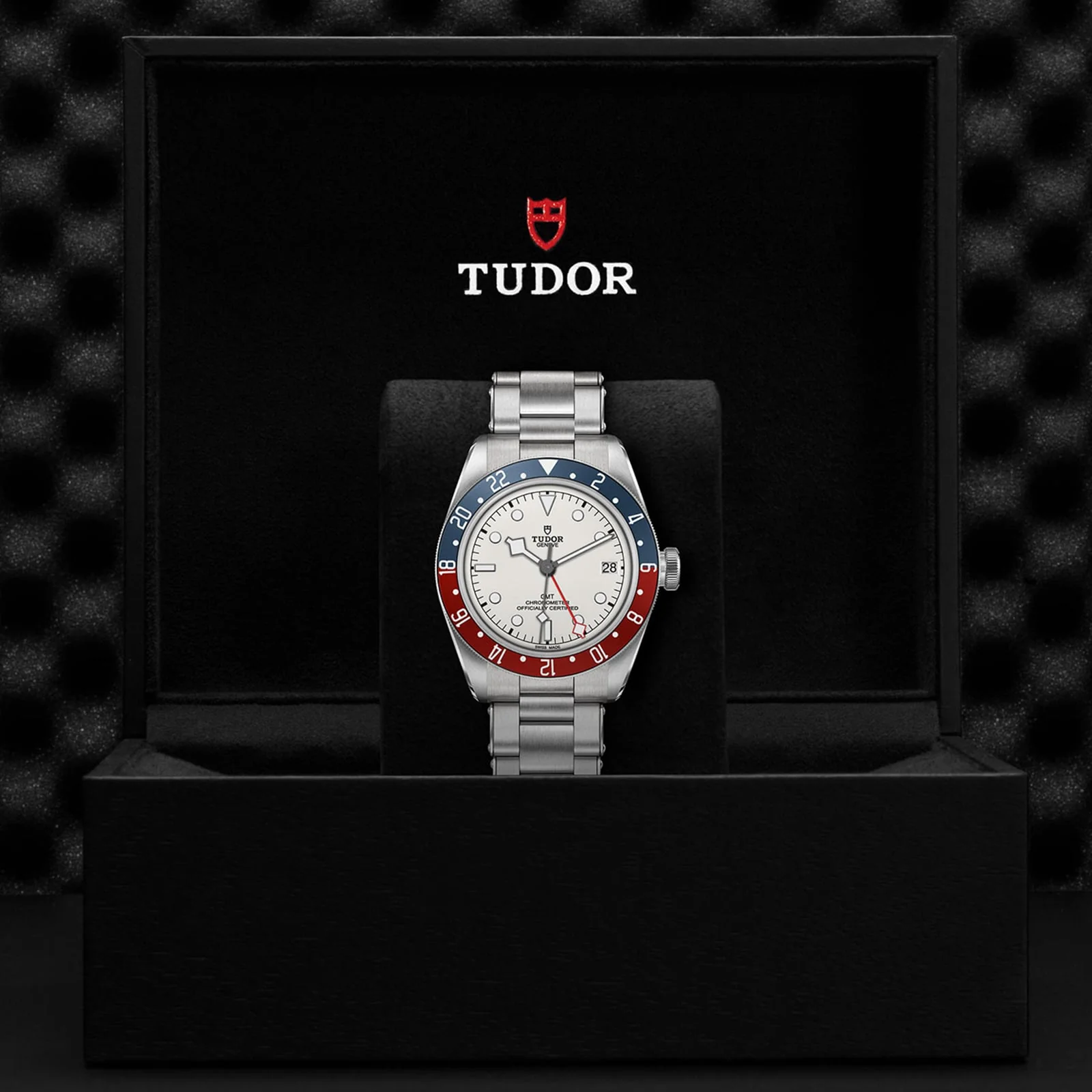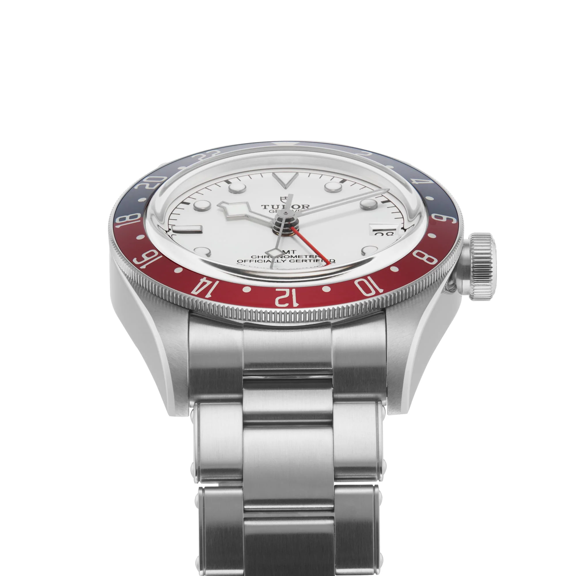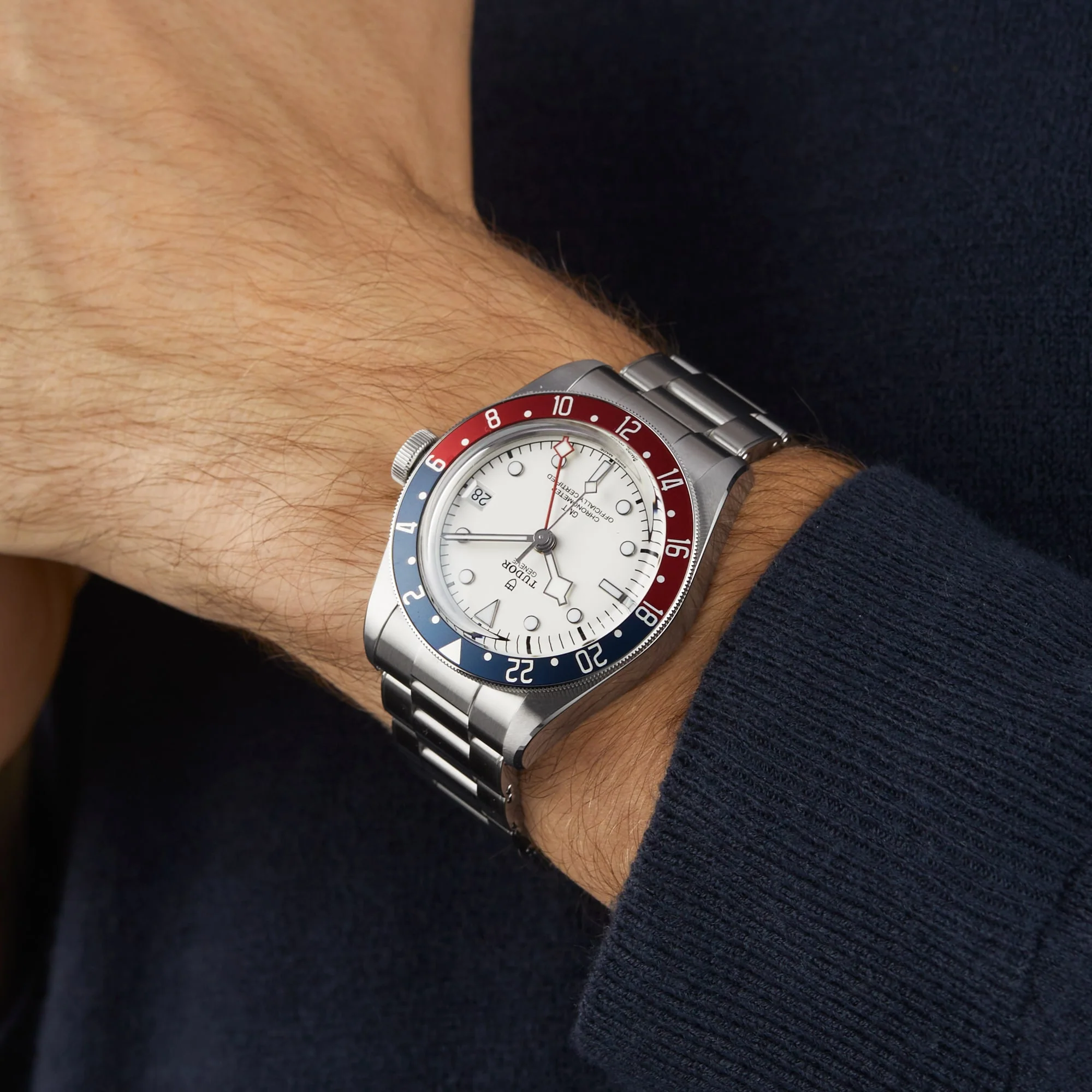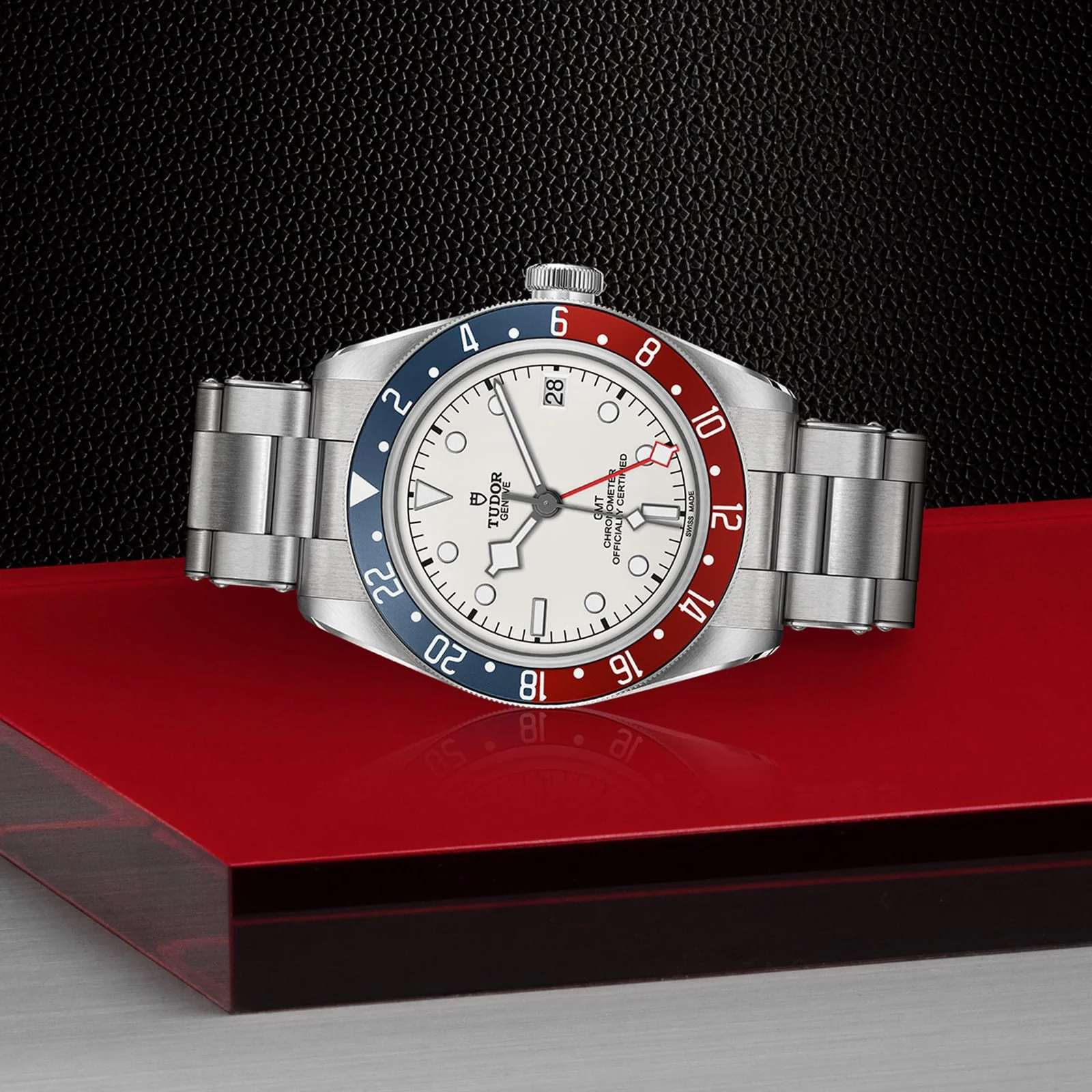 The TUDOR Black Bay GMT is made of the right stuff. First off, it sports an incredibly useful multiple time zone complication also known as a GMT function that establishes local time without losing sight of the time in two other time zones. Recognisable by its rotatable bezel, which borrows its deep blue and burgundy colour scheme from other models in the Black Bay line, but in a matte version, the Black Bay GMT is also a nod to the early days of this high flying aesthetic. Now TUDOR has added the option of an all new opaline dial that perfectly complements the iconic colour scheme of the Black Bay GMT. Opaline isn’t quite white, instead there’s a slight silvery hint to the dial. Through a galvanic process, a matte white grey finish is applied to the dial, and the marker surrounds are darkened to create a noticeable contrast.