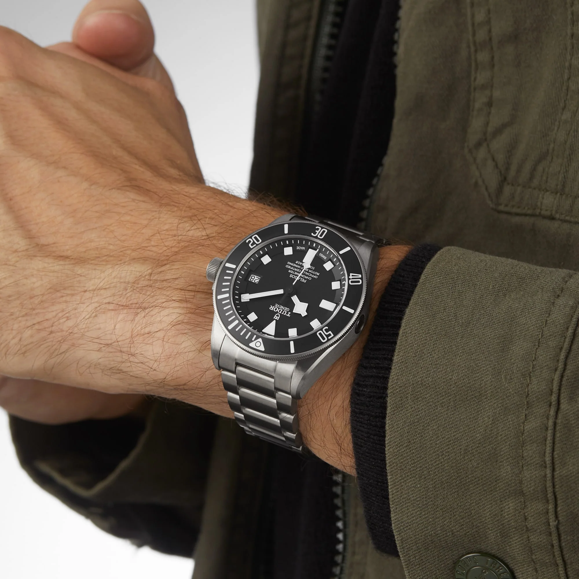 A symbol of adventure, this essential divers’ tool watch boasts high performance technical features built for extreme underwater conditions, including 500-meter water resistance. Offering the ultimate in diving performance, the titanium bracelet innovatively features a steel folding clasp. The unique technical spring mechanism allowing the bracelet to automatically adjust during a dive, contracting and expanding with the compression changes between the sea surface and depths. Supplied with an additional rubber strap and extra extension piece, there is a helium escape valve at 3 o’ clock, offering the watch protection from overpressure whilst in the sea. With a date window display, the dial is protected by scratch resistant sapphire crystal glass, adding to its robust durability. The stylish black dial is contrasted with bright luminescent markers and instantly distinguishable snowflake hands with a characteristic square tip, allowing for easy readability. Set within a 42mm titanium case, this high performance timepiece features a matt black ceramic unidirectional rotating bezel engraved with 60-minute markers. Powered by caliber MT5612 movement, certified by the Swiss Official Chronometer Testing Institute (COSC), this precision-focused watch boasts an impressive power reserve of up to 70 hours. +complimentary black rubber strap. Explore the full Tudor collection .