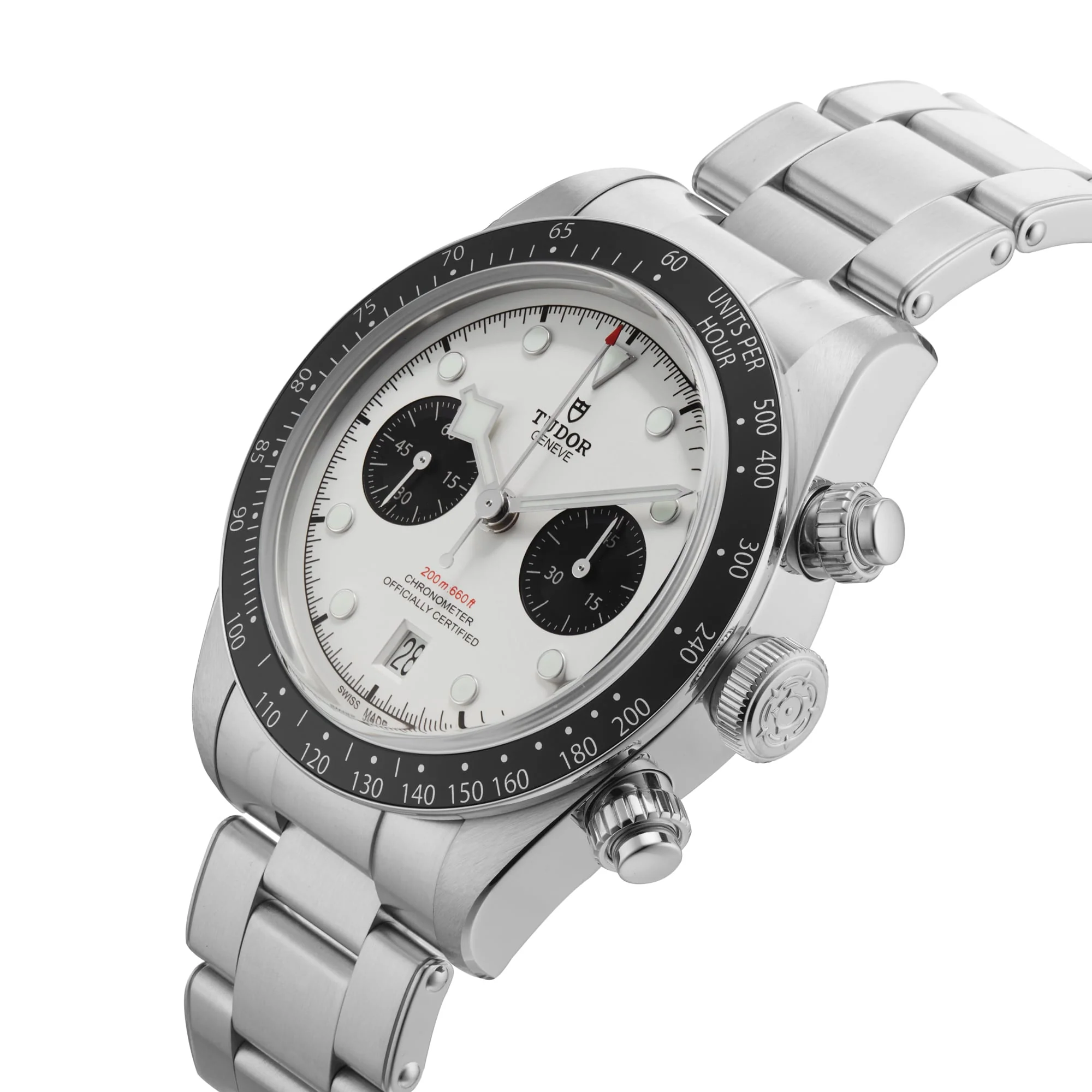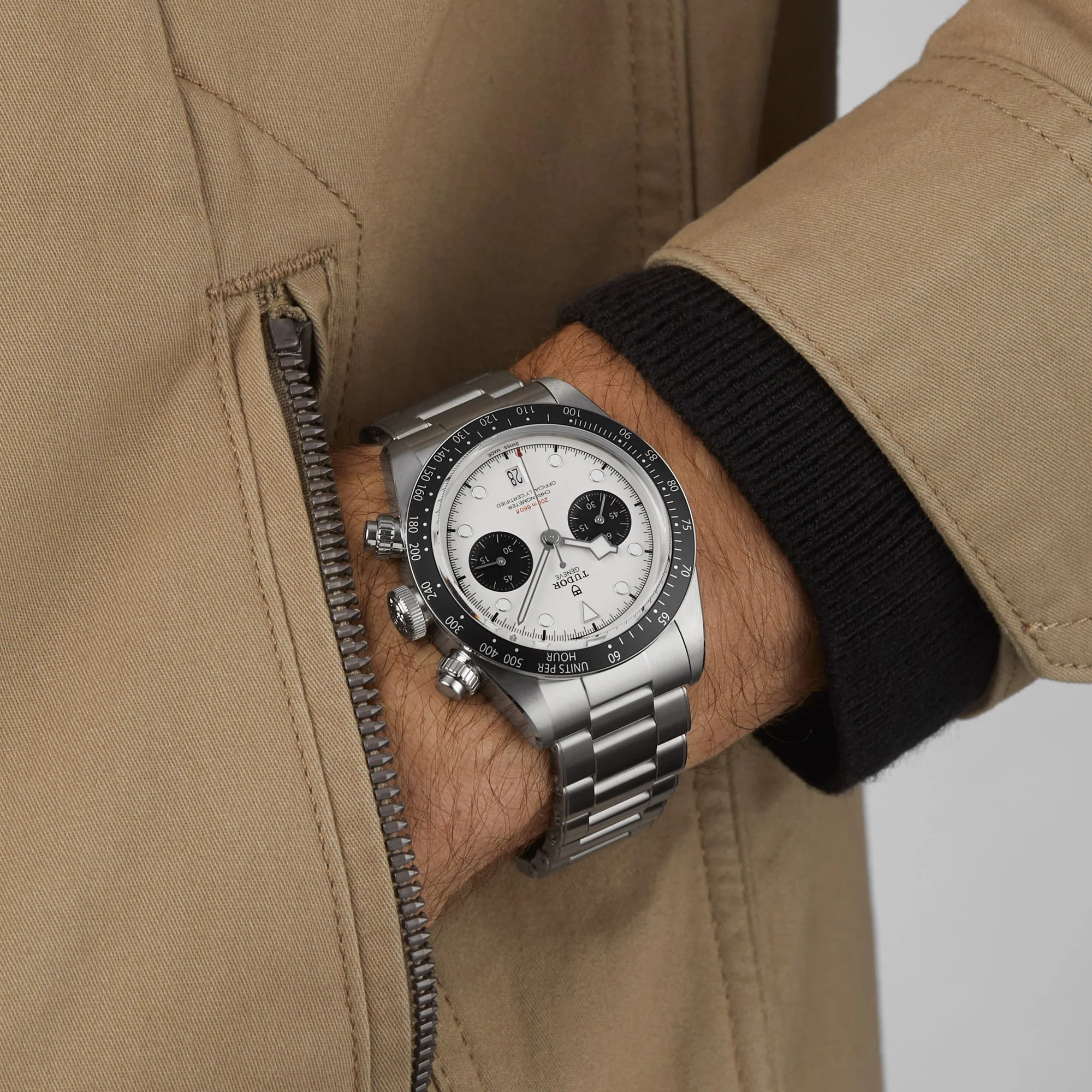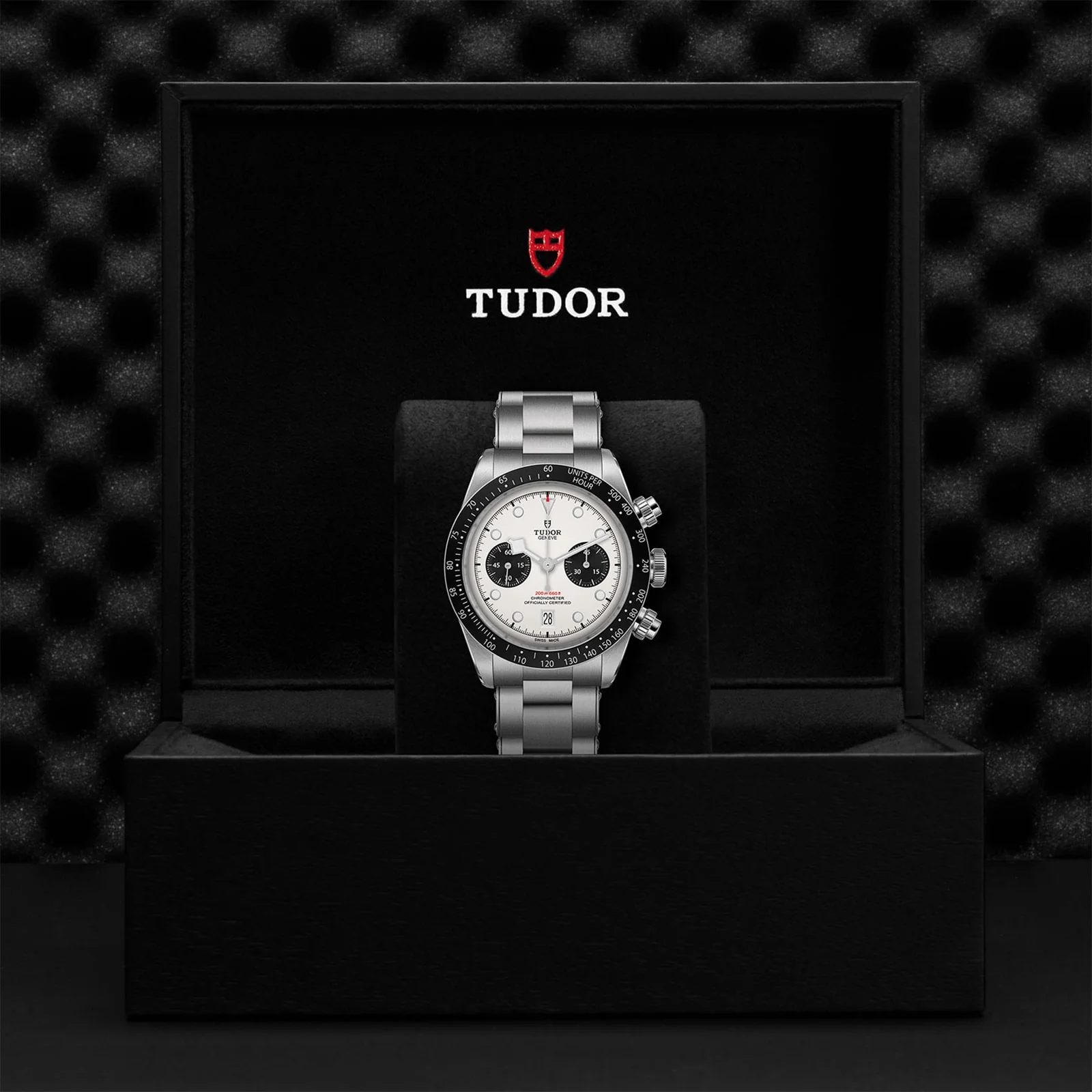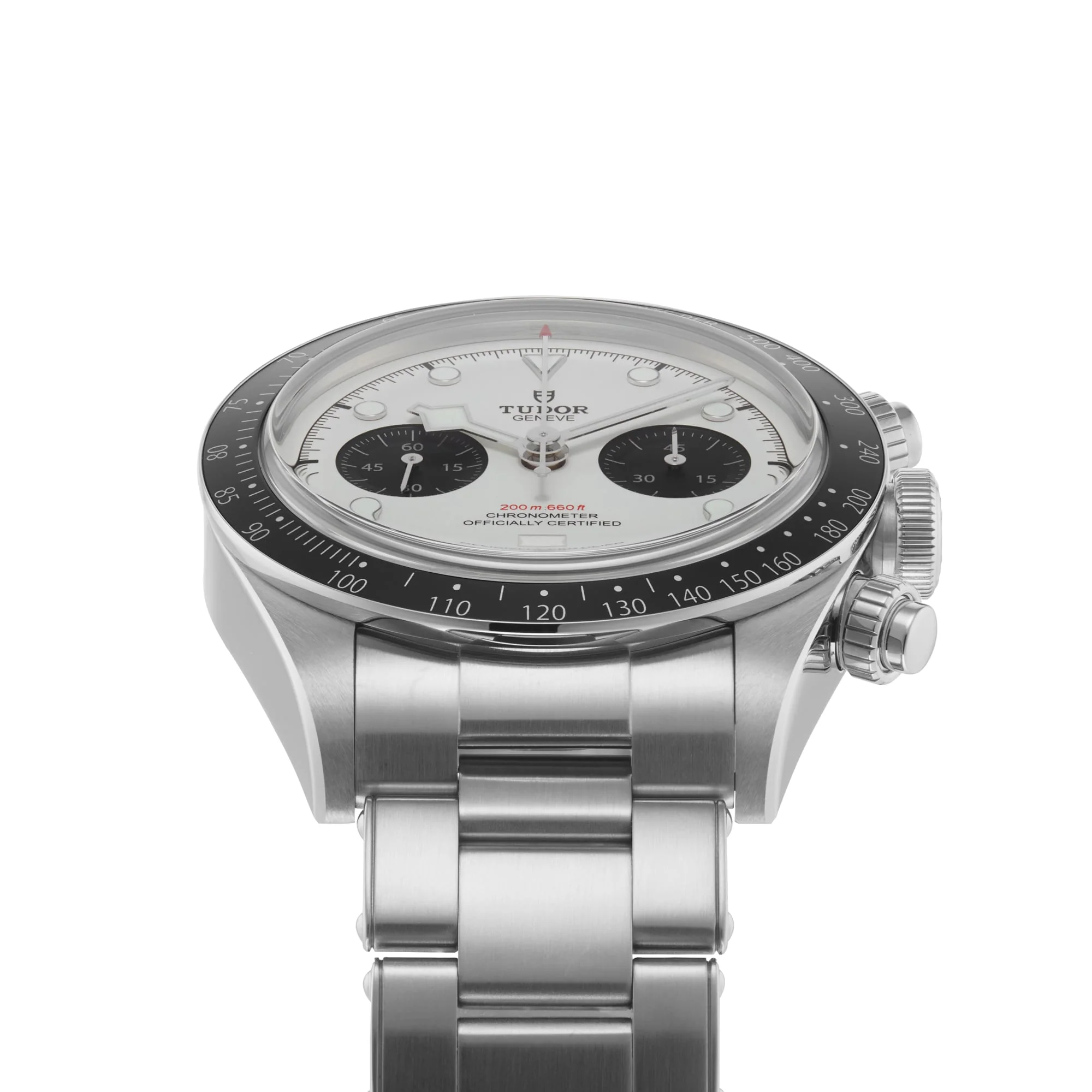 The hybrid Black Bay Chrono combines the heritage of divers' watches represented by the Black Bay family with the queen of the racetrack, the chronograph. The characteristics of the Black Bay collection are preserved in a steel case fitted with pushers inspired by the first generation of Tudor chronographs. A fixed bezel with an engraved tachymetric scale completes the face of this sporty chronograph.