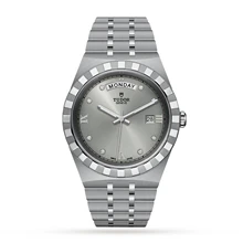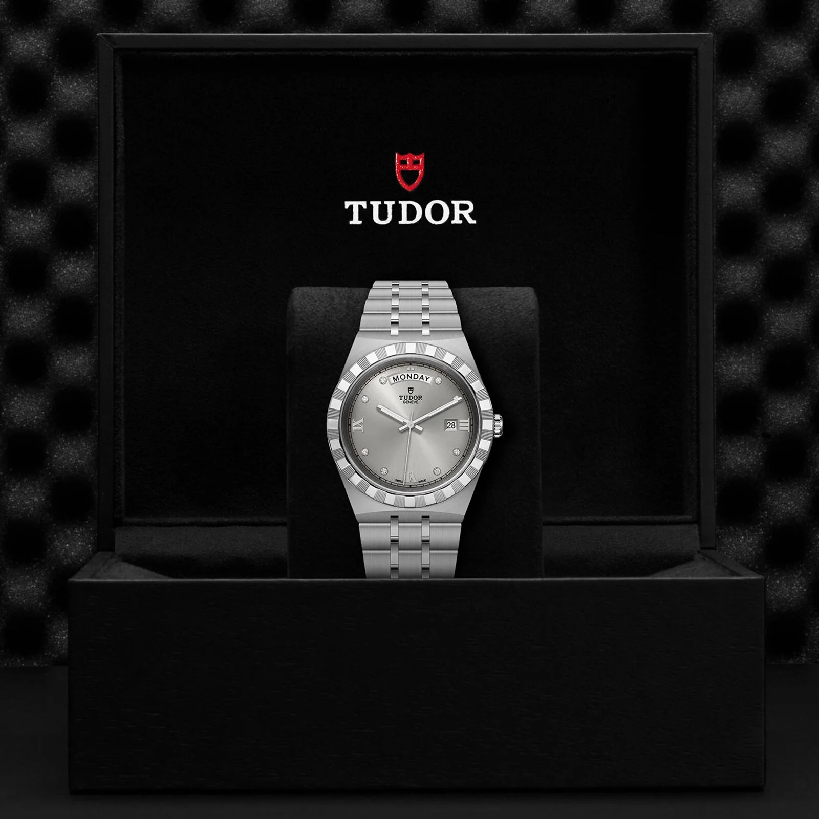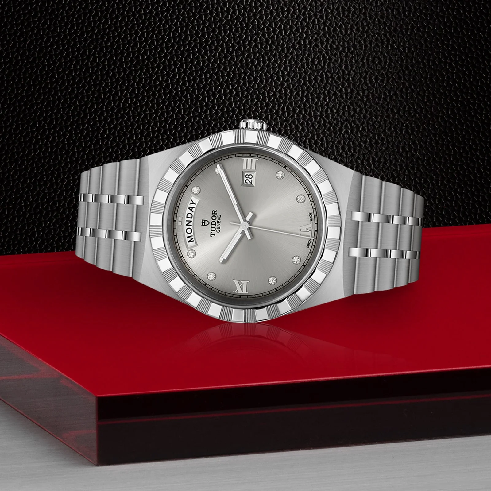 Royal is a name first used by TUDOR in the 1950s to emphasise the superior quality of its watches. The TUDOR Royal range is part of this heritage in that it offers automatic sport-chic watches with integrated bracelets that are as affordable as they are uncompromising. Cutting-edge technical performance and refined aesthetic are characteristic of this range, which sits at the crossroads between classic and sports watches. SPECIFICATIONS Case 41mm steel case with polished and satin finish Water Resistance Waterproof to 100 Metres Bezel Notched bezel in 316L steel, alternating cut grooves and polished finish Dial Silver, sunray-finish, with diamonds Applied Roman numerals Day of the week at 12 o'clock Date at 3 o'clock Crystal Sapphire crystal Movement Self-winding mechanical movement, calibre T603 Power Reserve Power reserve of approximately 38 hours Winding Crown Steel crown winding crown with the Tudor logo Bracelet Intergrated bracelet in 316L steel, 5 rows, satin-brushed external and central links, polished intermediate links, with folding clasp and safety catch