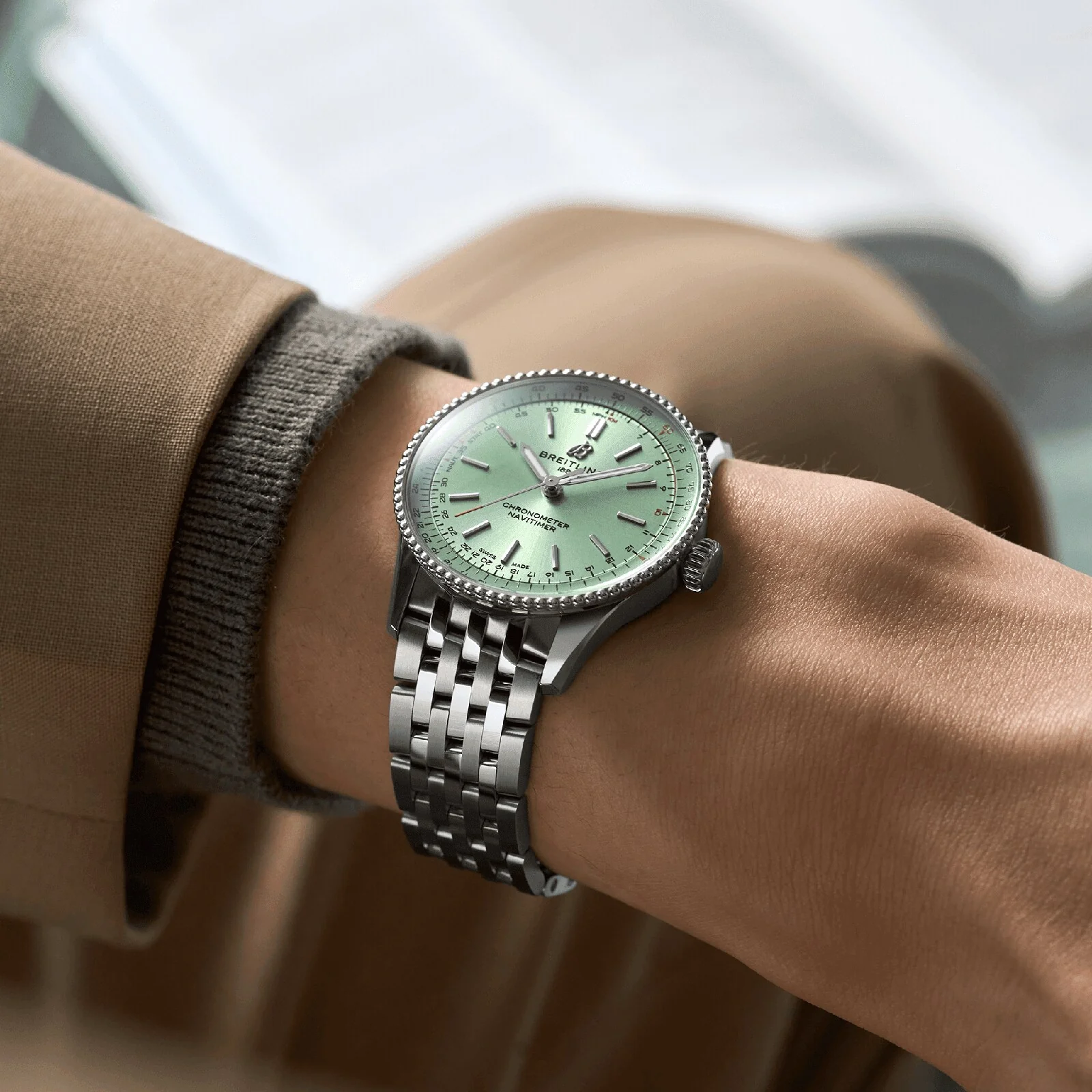 Navitimer - from flight tool to icon Introducing a watchmaking legend to a whole new generation Beautifully housed in a 36mm stainless steel case Refreshing mint green dial framed by a distinct beaded bezel Powered by the Breitling 17 self-winding movement with a 38-hour power reserve ONE OF THE MOST RECOGNISABLE WATCHES EVER MADE For 70 years, the Navitimer has been one of the most beloved mechanical chronographs in the world. Refined and elegant, the Navitimer 36mm brings together the historic appeal of a true icon with the sophistication of a contemporary timepiece, introducing the watchmaking legend to a whole new generation. Pops of pastel, mother-of-pearl, and precious materials sit alongside subtle refinements to give a jewellery-like appeal and versatile elegance. A SLENDER NEW LOOK With a truly unmistakable appearance, this striking timepiece is presented in a 36mm stainless steel case, secured with a matching steel bracelet. Framed by a distinct, stainless steel beaded bezel and the iconic circular slide rule, the refreshing mint green dial adds a pop of colour, whilst remaining otherwise understated with silver hands and hour markers, a red-tipped seconds hand, and a tachymeter scale. The Breitling 17 self-winding movement provides flawless precision while water resistance to 3 bars (30 metres) and a 38-hour power reserve enhance performance.
