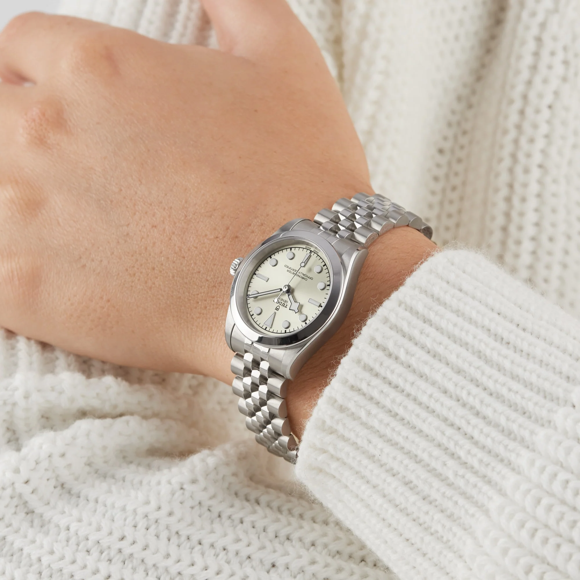 The Black Bay One 31/36/39/41 models bring a unique aesthetic to the Black Bay One line. The curved cases feature a combination of finishes that elevates the watch in a contemporary fashion and offers a design language that slightly departs from the brand’s iconic tool watch spirit to embrace a sophisticated, versatile, unisex chic look and feel. Fitted with Manufacture Calibres these models are at the cutting edge of technical watchmaking refinement. All Black Bay One 31/36/39/41 models are available on a five link bracelet in 316L steel. It comes complete with a robust clasp in 316L steel with TUDOR “T fit” rapid adjustment system for on the fly size changes. Easy to use, requiring no tools and offering five positions, this practical system allows the wearer to carry out a fine, instant adjustment of up to 8mm on the clasp.